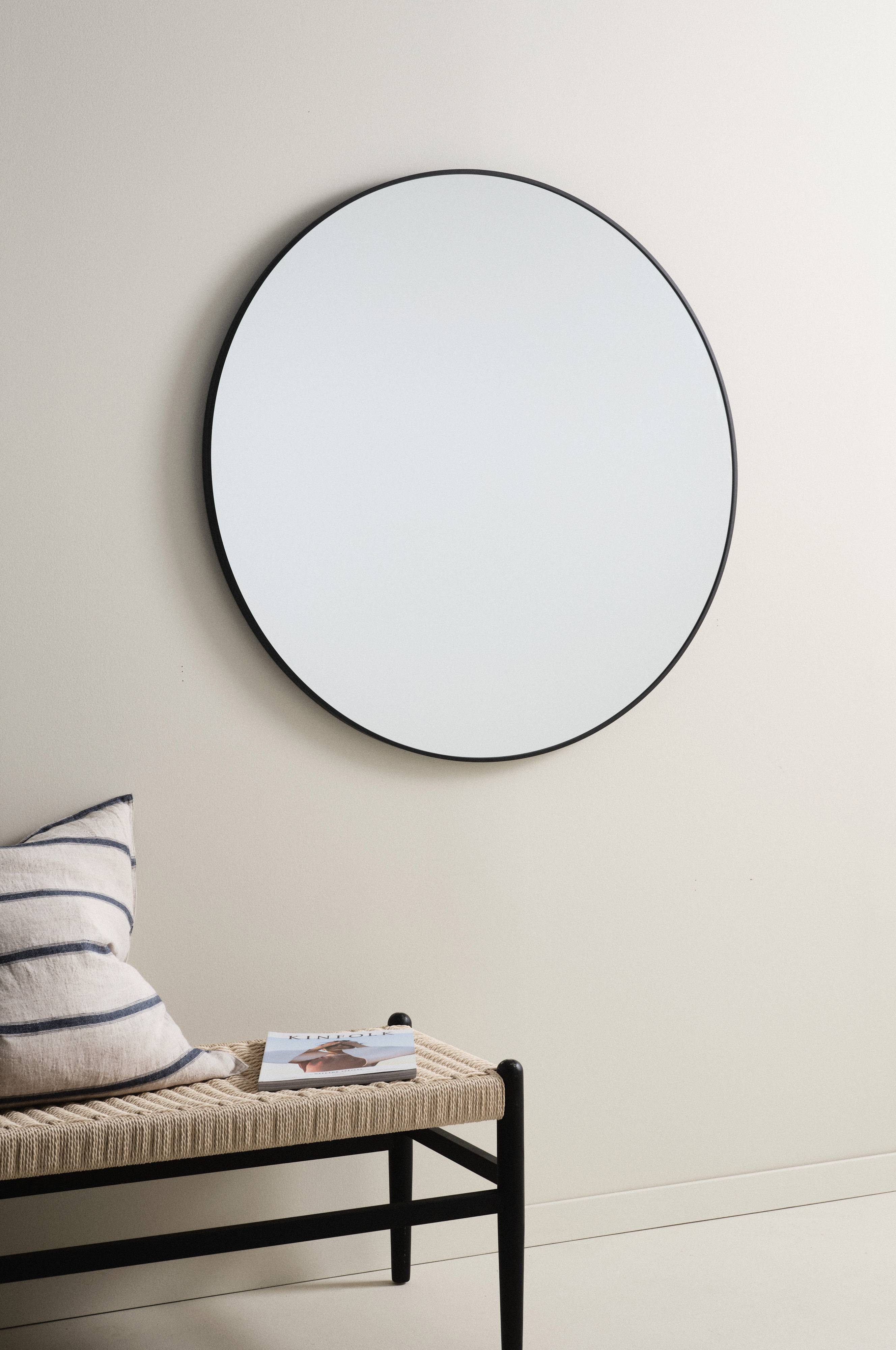 Rundt speil med lekker aluminiumsramme. Baksiden er av MDF. Skjult oppheng på baksiden.
