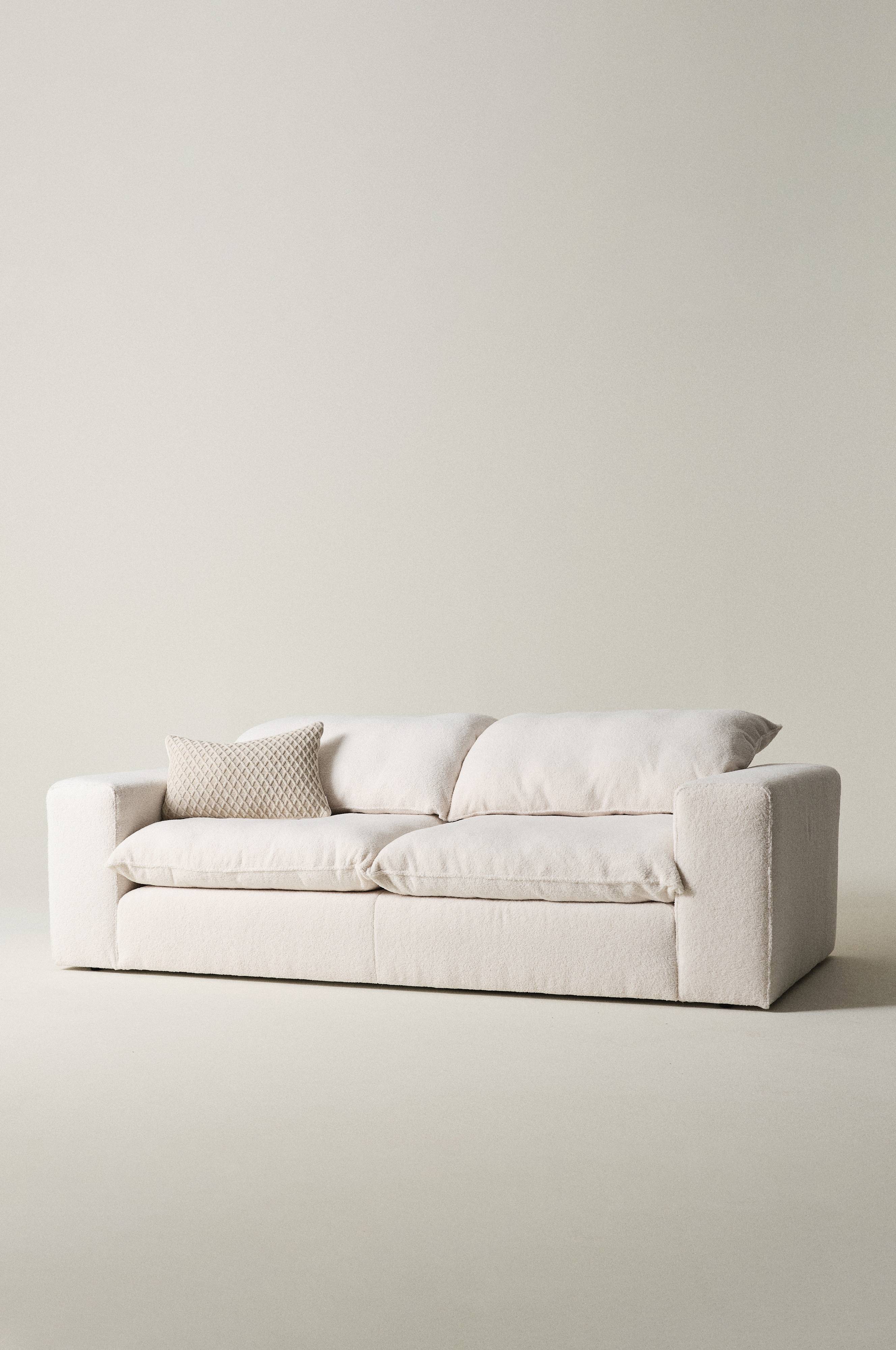 Den dype sofaen MELIDES er det perfekte supplement til stuen din. Sofaen har et koselig Teddy-stofftrekk laget av resirkulert polyester som gir enestående komfort. Den minimalistiske designen og den allsidige hvite fargen gjør den til et stilig midtpunkt i ethvert hjem. Modellen er innbydende, komfortabel og avslappet. Sofaens trekk er ikke avtakbart, men putene har avtakbart trekk.