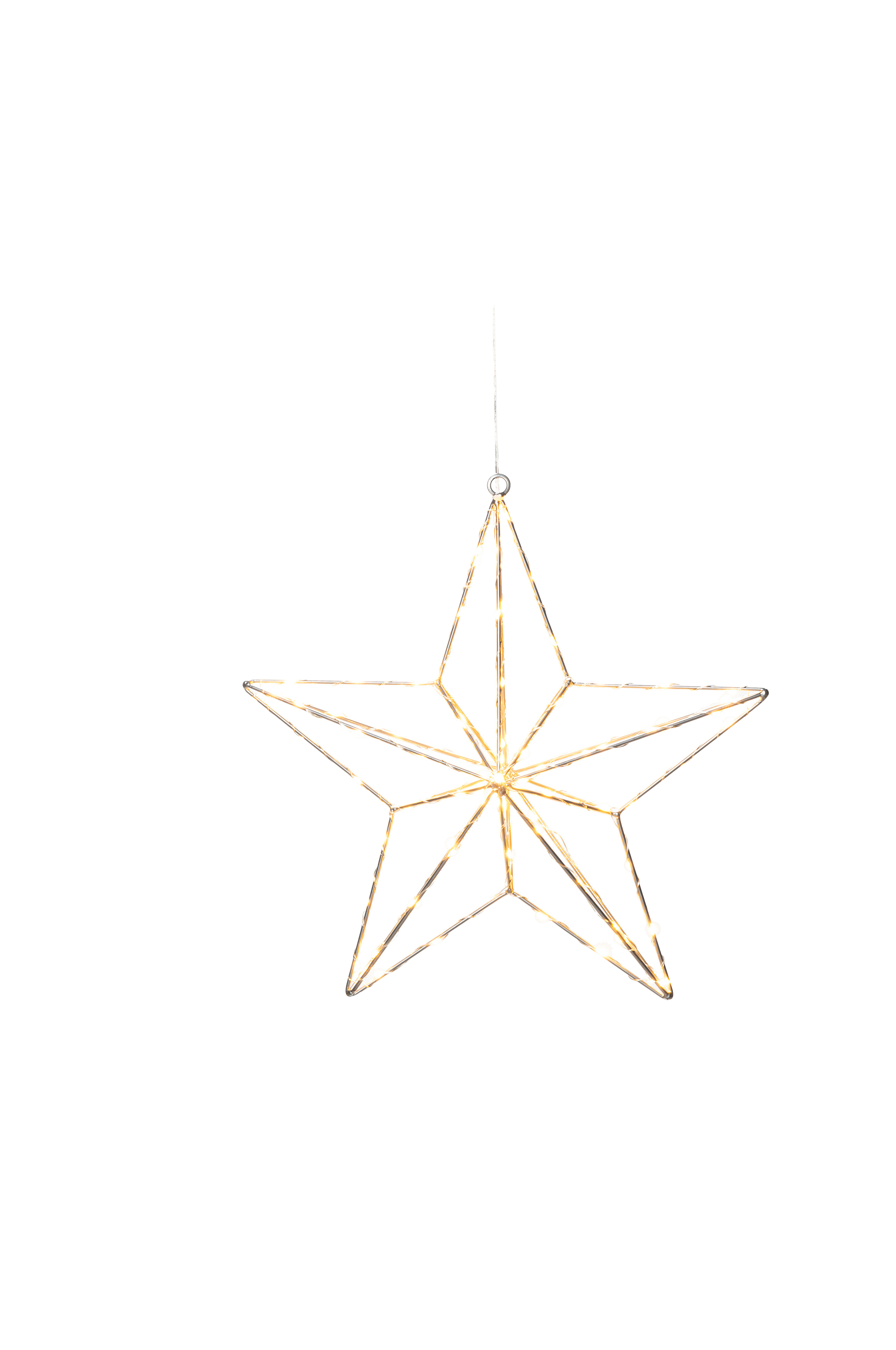 Metallstjerne for innendørs bruk med 90 ravfargede mikro-LED. Drives av en 4,5 V transformator. Gullfarget ledning og tilkoblingsledning på 5 meter.