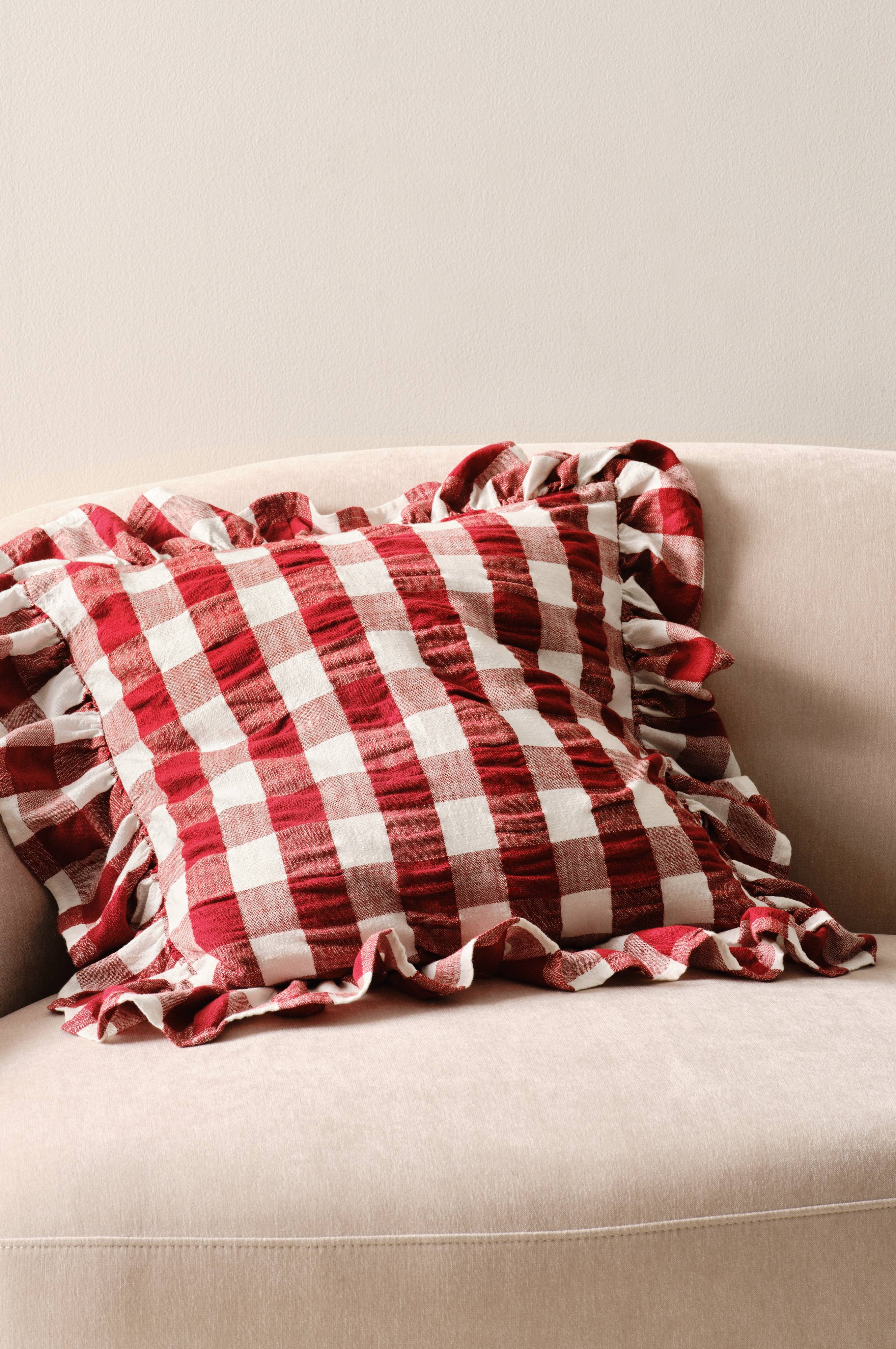 MIMMI-putevaretrekket har et garnfarget rutete mønster og er laget av seersuckerstoff i bomull. Putetrekket har en volangkant rundt og et klassisk rutete mønster. Skjult matchende glidelås på baksiden.