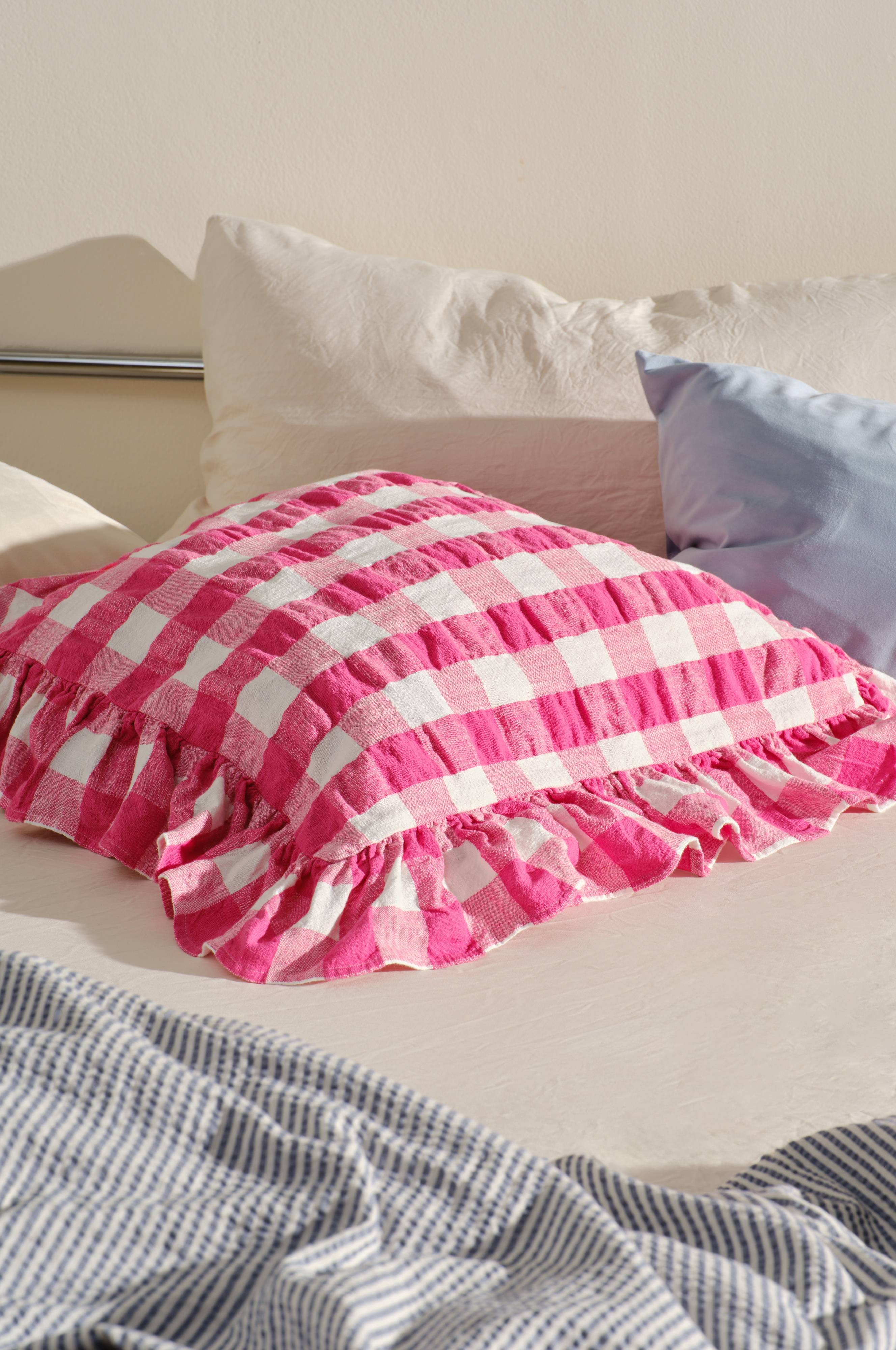 MIMMI-putevaretrekket har et garnfarget rutete mønster og er laget av seersuckerstoff i bomull. Putetrekket har en volangkant rundt og et klassisk rutete mønster. Skjult matchende glidelås på baksiden.