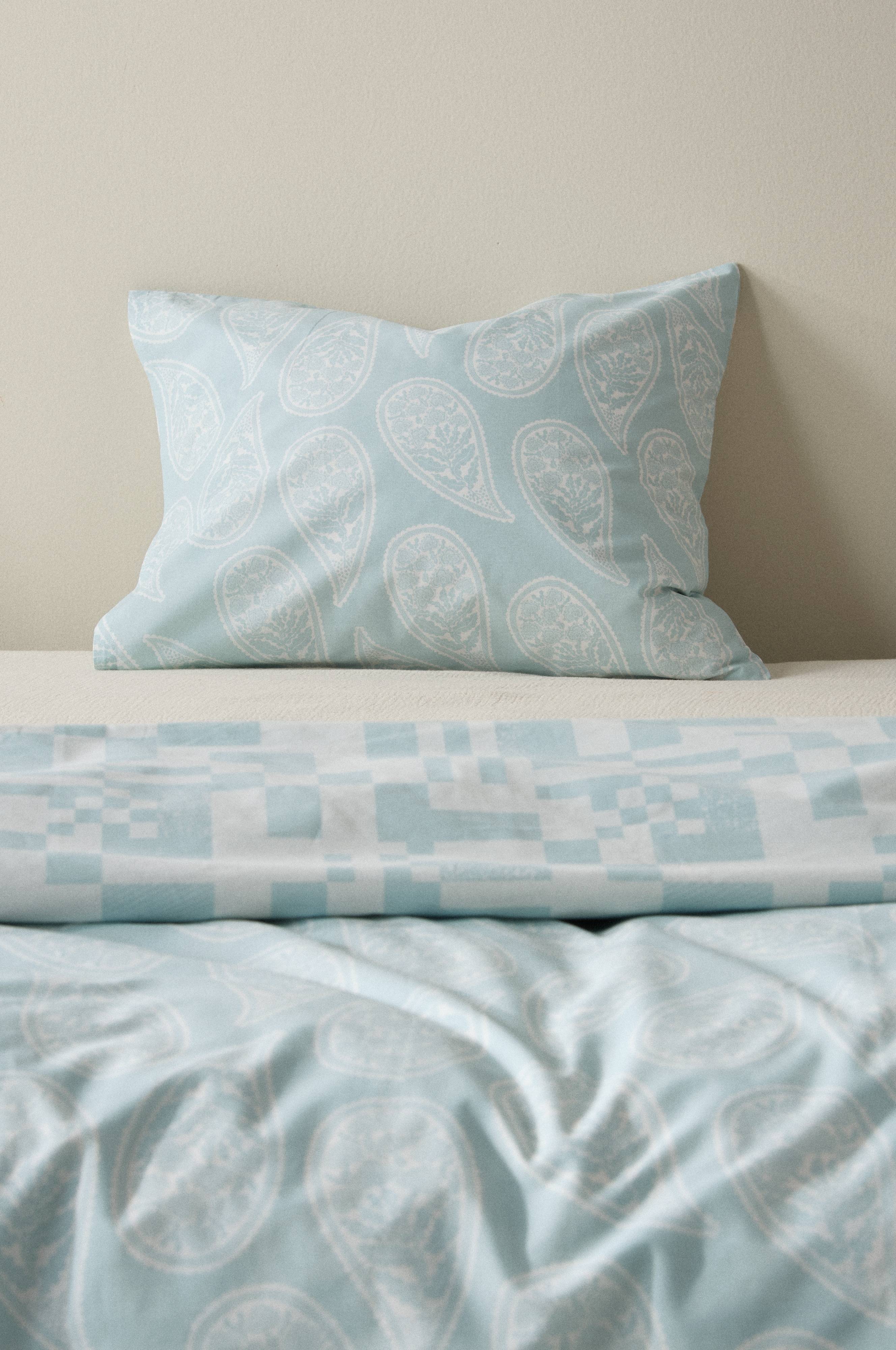 Putevar av deilig bomull med trykt mønster, designet av Maria Carlberg. Putevaret er vendbart. Den ene siden har fint grafisk mønster av firkanter og den andre siden har et litt mer romantisk paisleymønster i hvitt på farget bunn. Du kan enkelt variere oppredningen etter humør. Den herlige bomullskvaliteten er myk og sval mot kroppen. Trådtetthet på 144 tc. (Trådtettheten forteller om antallet tråder, thread counts, pr. kvadrattomme i et stoff. Jo høyere trådtetthet, desto høyere kvalitet. Unntaket er lin som ofte veves løsere for å få den riktige følelsen.)