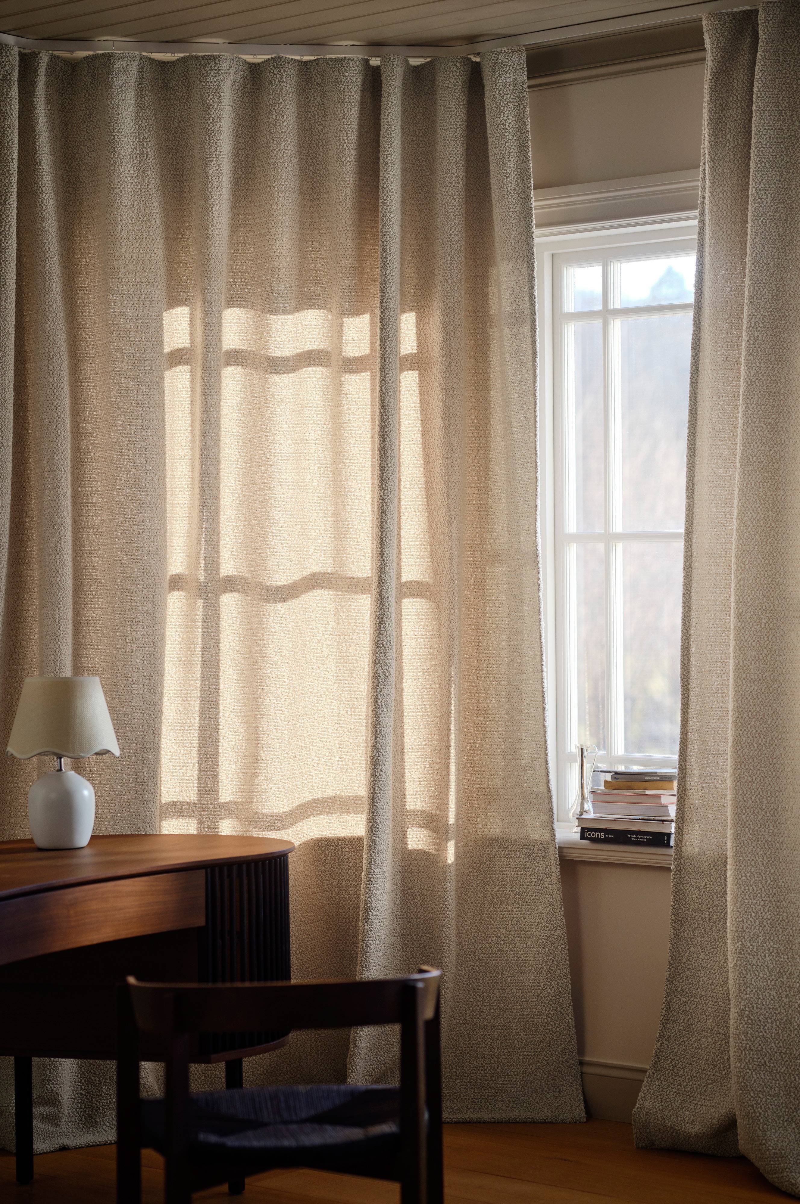 MOLLY bouclé-gardin er laget av tykt, luksuriøst boucléstoff og gir en hotellinspirert atmosfære som tilfører tekstur og varme til ethvert rom. Den er designet med skreddersydde mål for perfekt passform fra tak til gulv, noe som skaper en innbydende og raffinert atmosfære. Perfekt for deg som ønsker både komfort og stil i hjemmet.