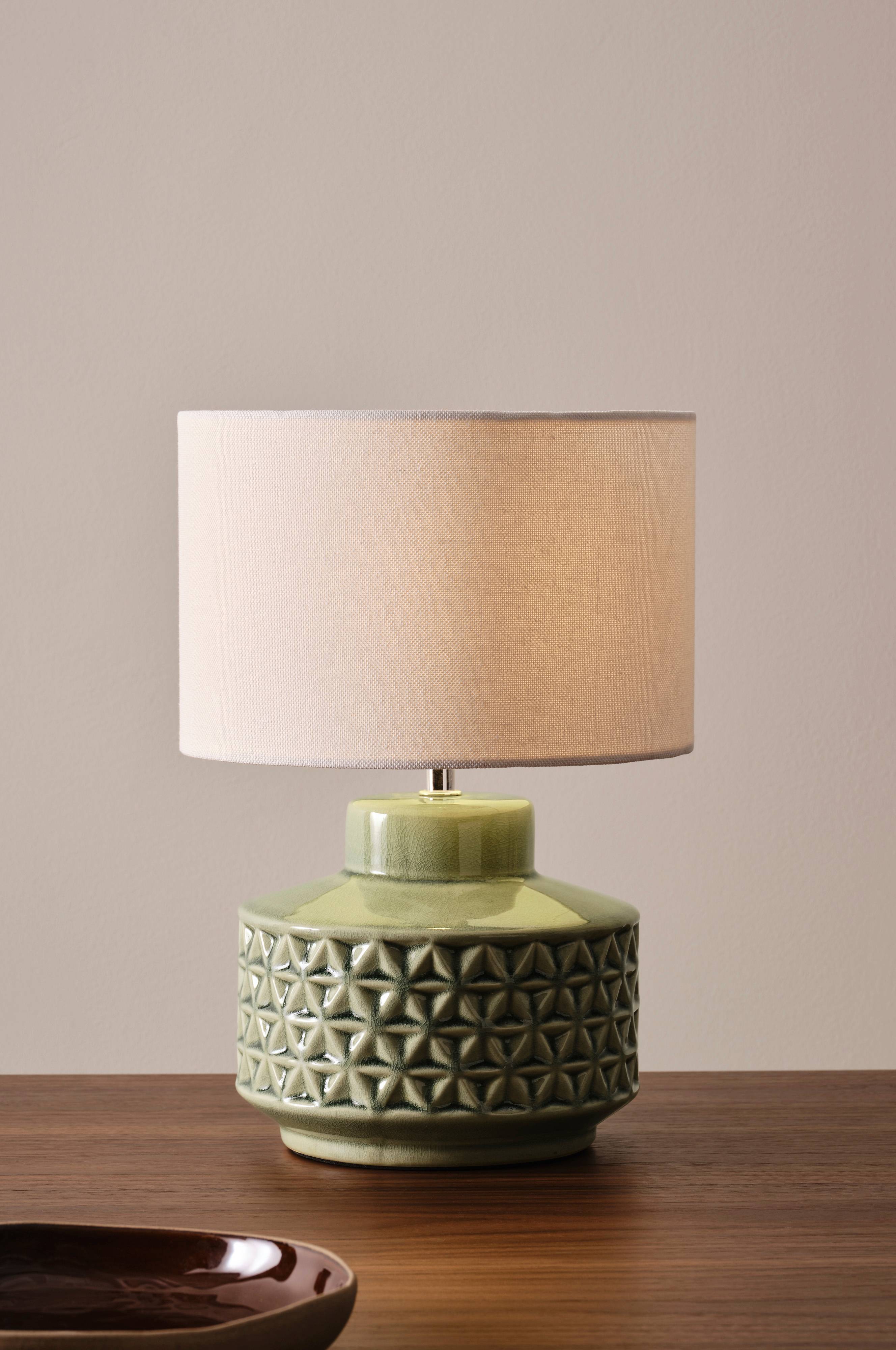 Bordlampe med en mykt formet keramikkfot og stoffskjerm av lin.