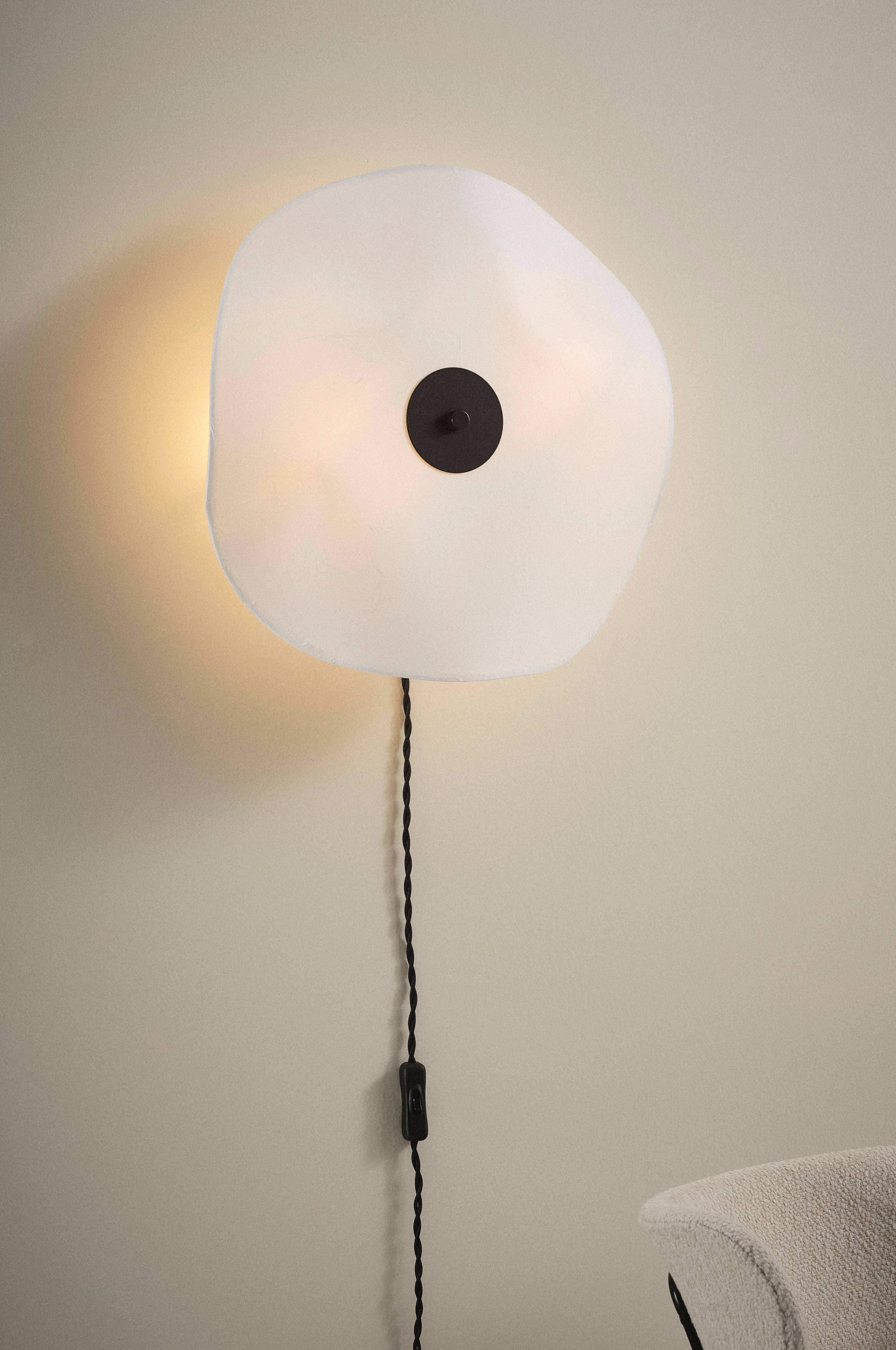 Vegglampe med mykt bølgende lampeskjerm av papir med marmorert tekstur. Lampefestet er av mattsvart metall og den effektfulle ledningen er en tvinnet, svart tekstilkledd ledning med strømbryter på ledningen. Metallfeste til å sette på veggen.