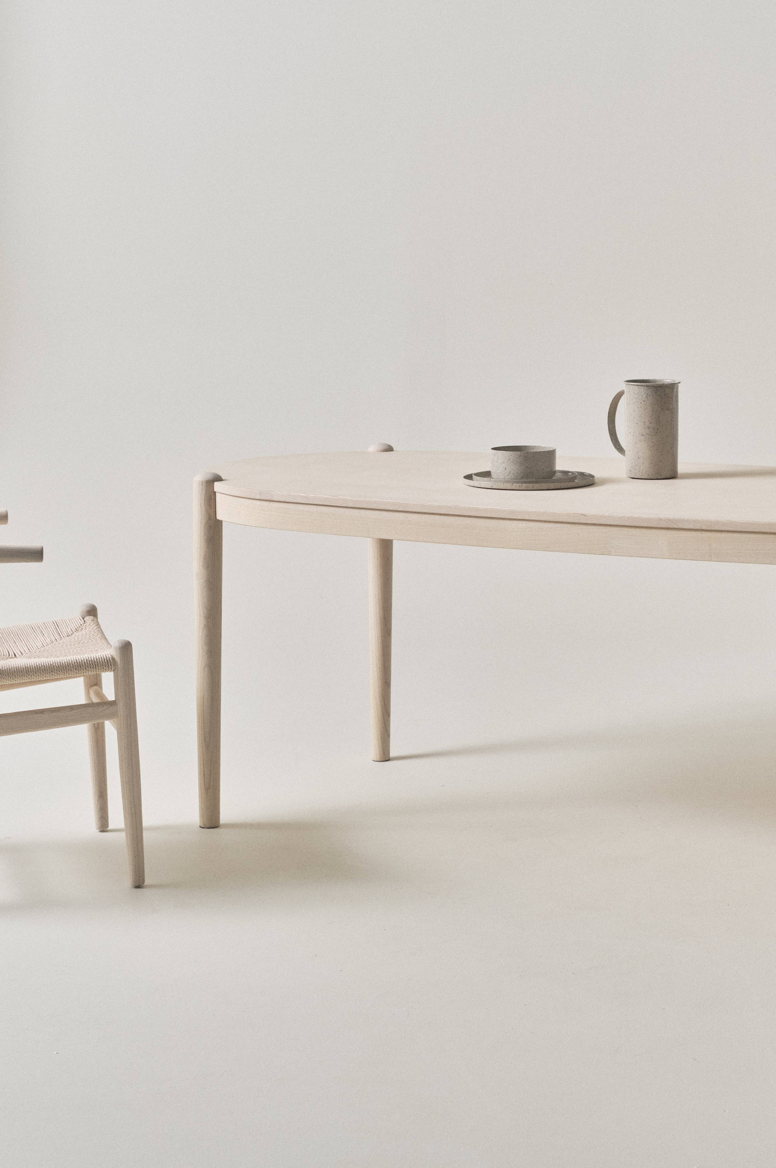 Spisebordet er laget av almetre, og bordplaten er belagt med almefinér. Spisebordet er ovalt i formen, og bena som er plassert i ytterkanten og samtidig innfelt i bordplaten, gir bordet sin fine karakter. Benenes plassering gjør det enkelt å sitte mange ved bordet. Bordet er tilgjengelig i flere ulike, vakre utførelser, så velg den fargen som passer best i ditt hjem.