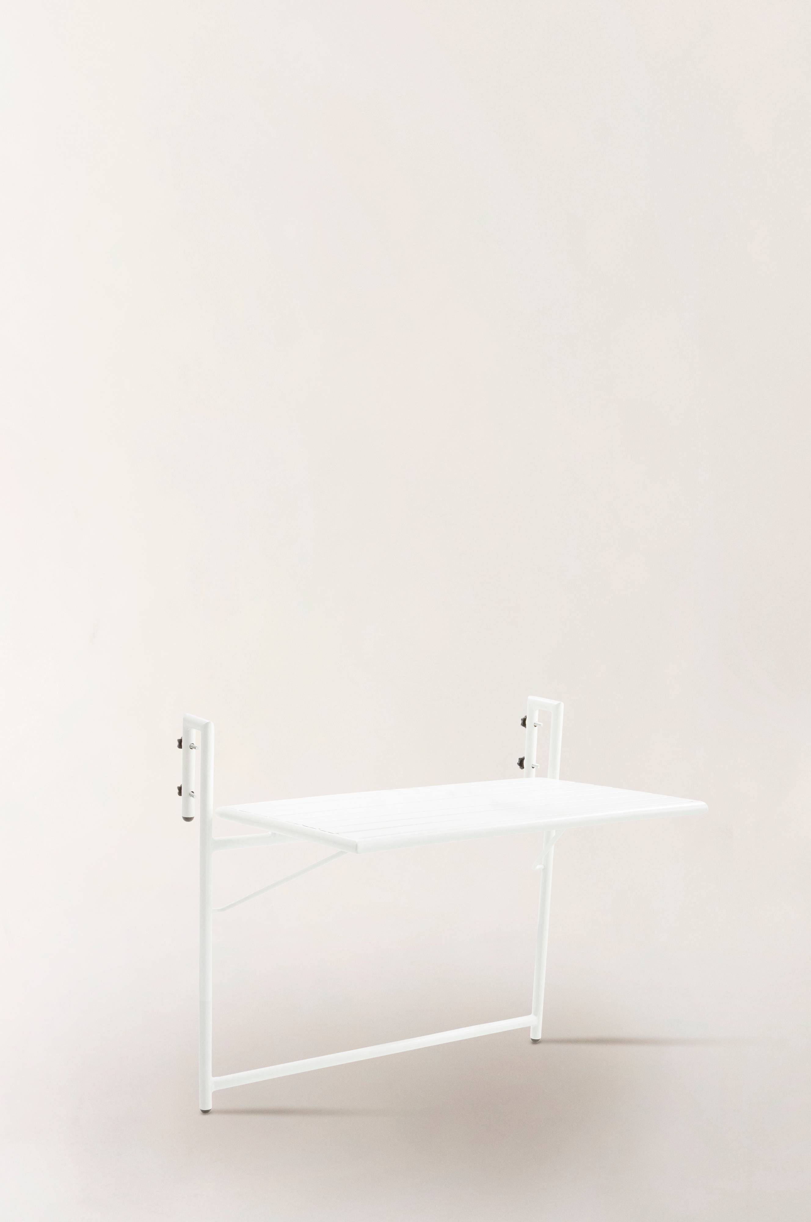 Balkongbord av pulverlakkert aluminium med matt overflate som ikke blender i solskinnet. Praktisk modell hvor du feller ut bordet når du trenger det. Ellers kan det henge nedfelt uten å ta plass. NAVONA tåler å henge utendørs på balkong- eller terrasserekkverket. Du slipper å bære så fort du vil sitte ute. Lav vekt.