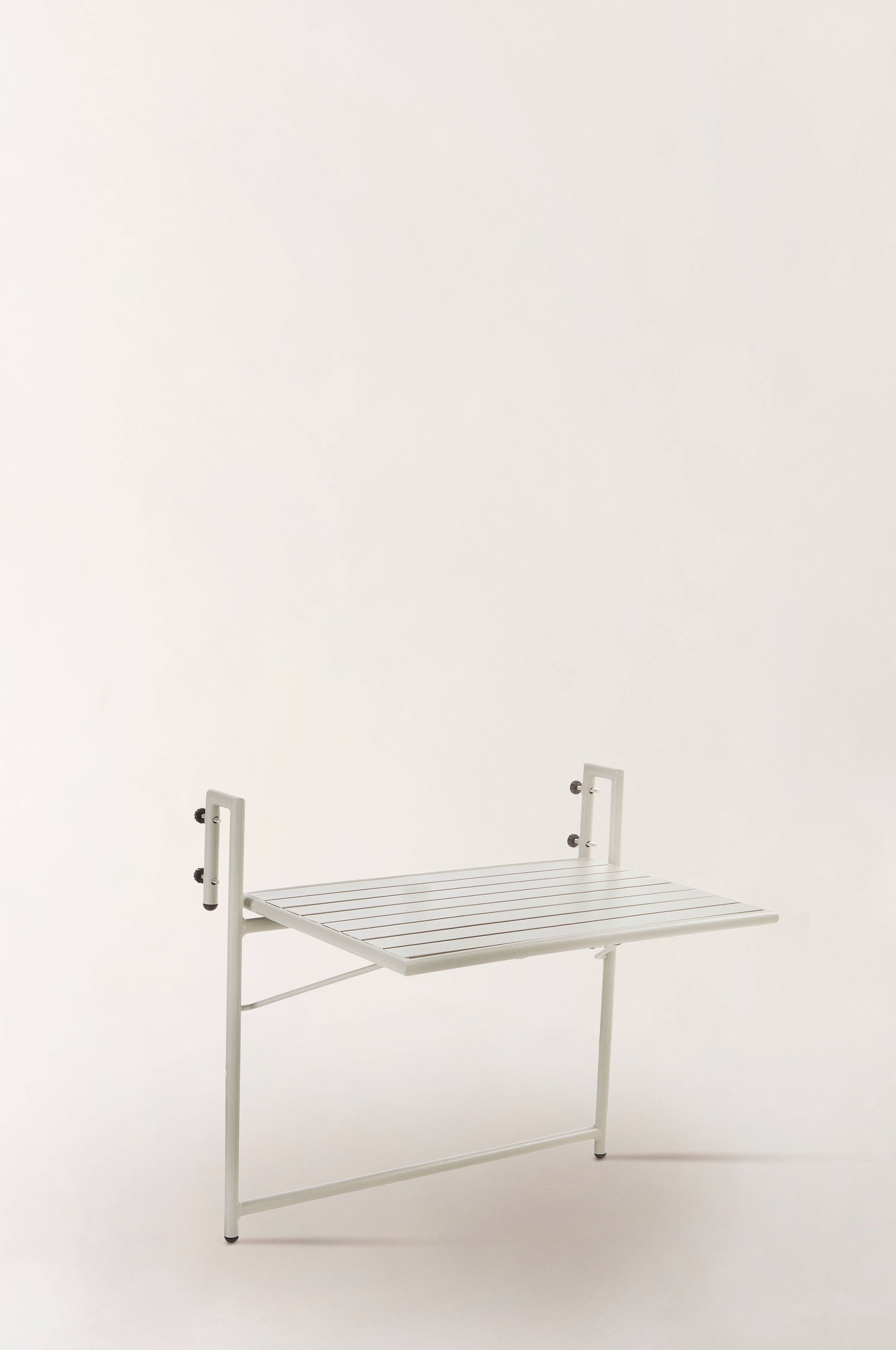 Balkongbord av pulverlakkert aluminium med matt overflate som ikke blender i solskinnet. Praktisk modell hvor du feller ut bordet når du trenger det. Ellers kan det henge nedfelt uten å ta plass. NAVONA tåler å henge utendørs på balkong- eller terrasserekkverket. Du slipper å bære så fort du vil sitte ute. Lav vekt.