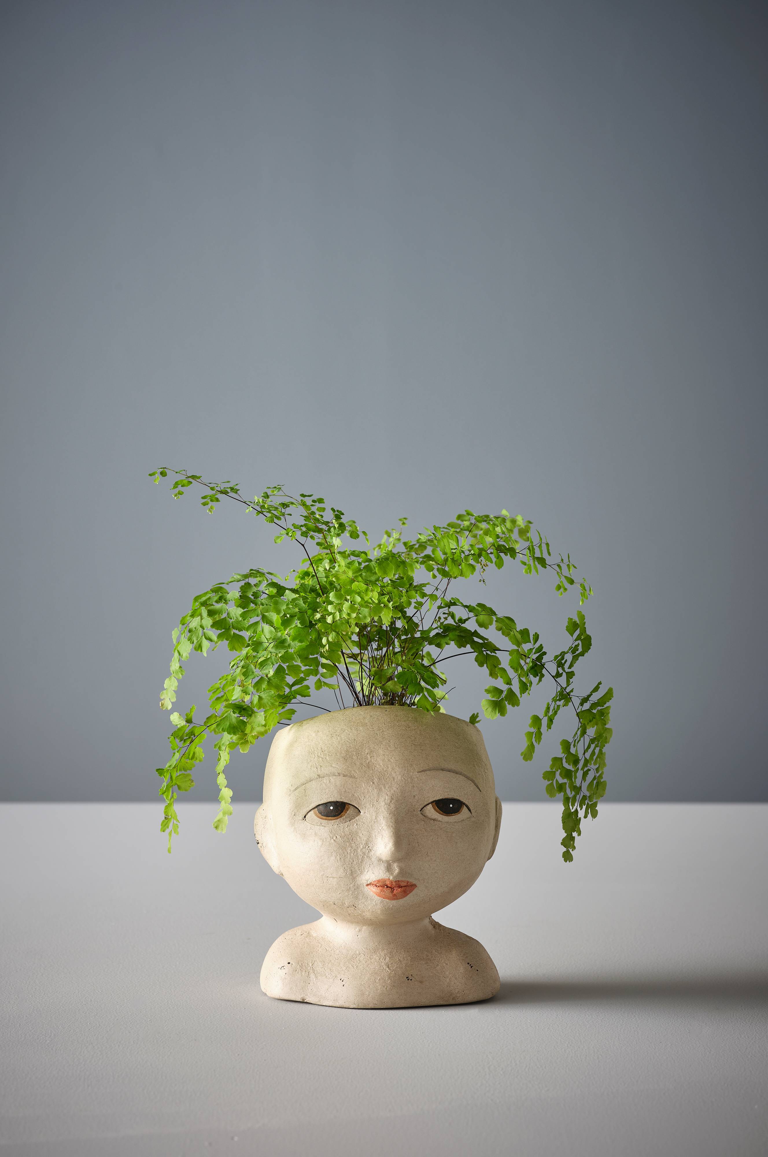 Krukke i polyresin som forestiller et hode med åpne øyne. Overflaten minner om kalkstein, og gir en litt brukt følelse med herlig patina.