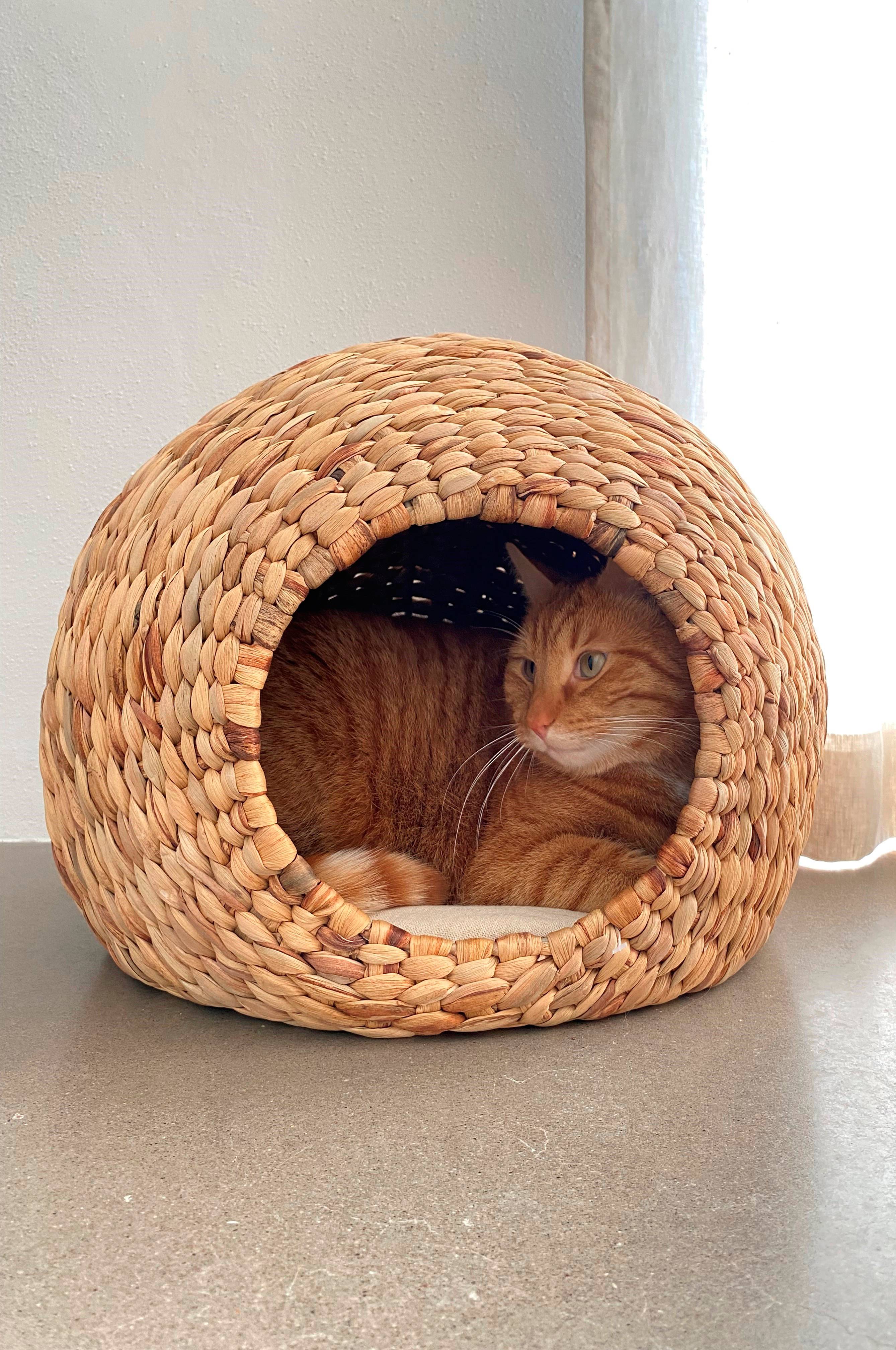 NIKO er en lun og koselig hunde- eller katteseng. Mange små hunder og mange katter liker å krype inn i en liten «hytte» hvor det blir varmt og deilig. Sengen er av vannhyasint som er flettet for hånd til en rund kurv. I sengen ligger det en liten madrass av lin. Er din lille firbente venn litt frossen, er denne sengen et perfekt valg. Det fine håndverket gjør hver seng unik.