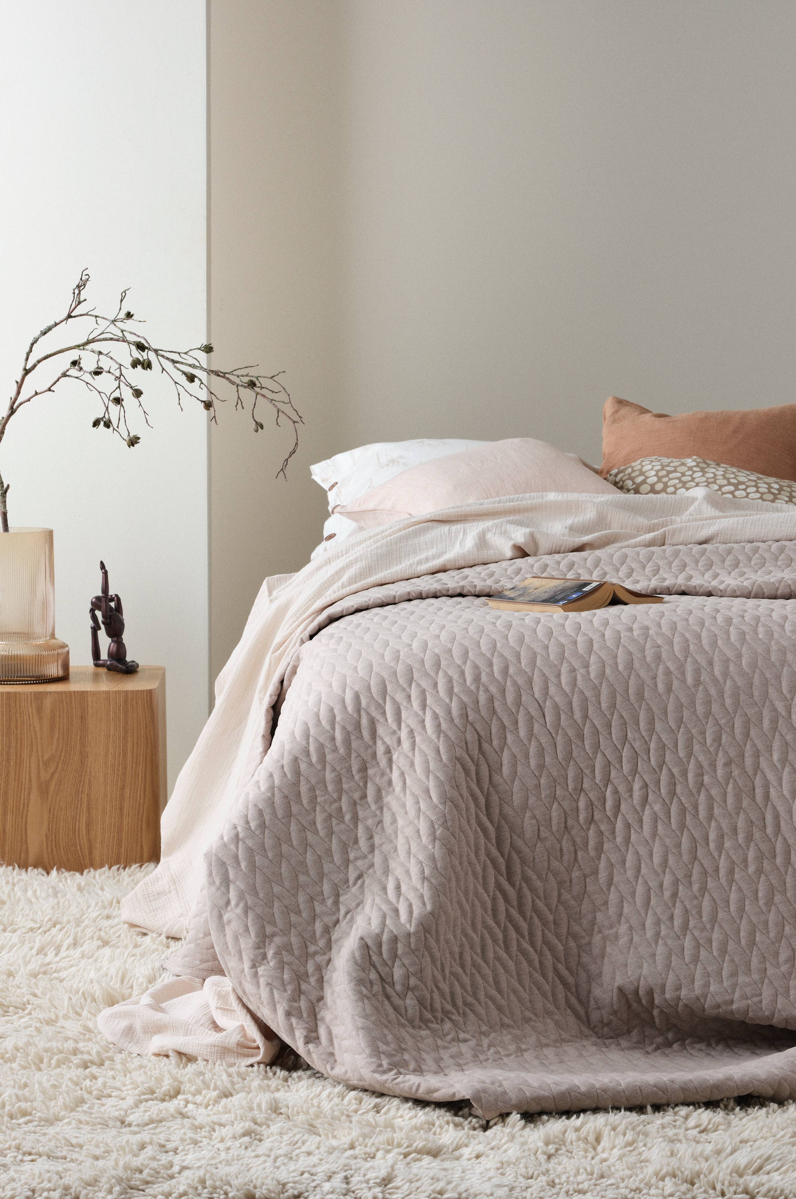 Sengeteppe til dobbeltseng. Sengeteppe av polyester med herlig linfølelse og uregelmessig quiltet mønster. Sømmene, som gir et dekorativt mønster, holder også fyllet på plass. Sengeteppet får en kompakt og smidig følelse som gjør det enkelt å håndtere og enkelt å re opp med. Søm rundt gir en fin kant. Putetrekk medfølger ikke, kjøpes separat.