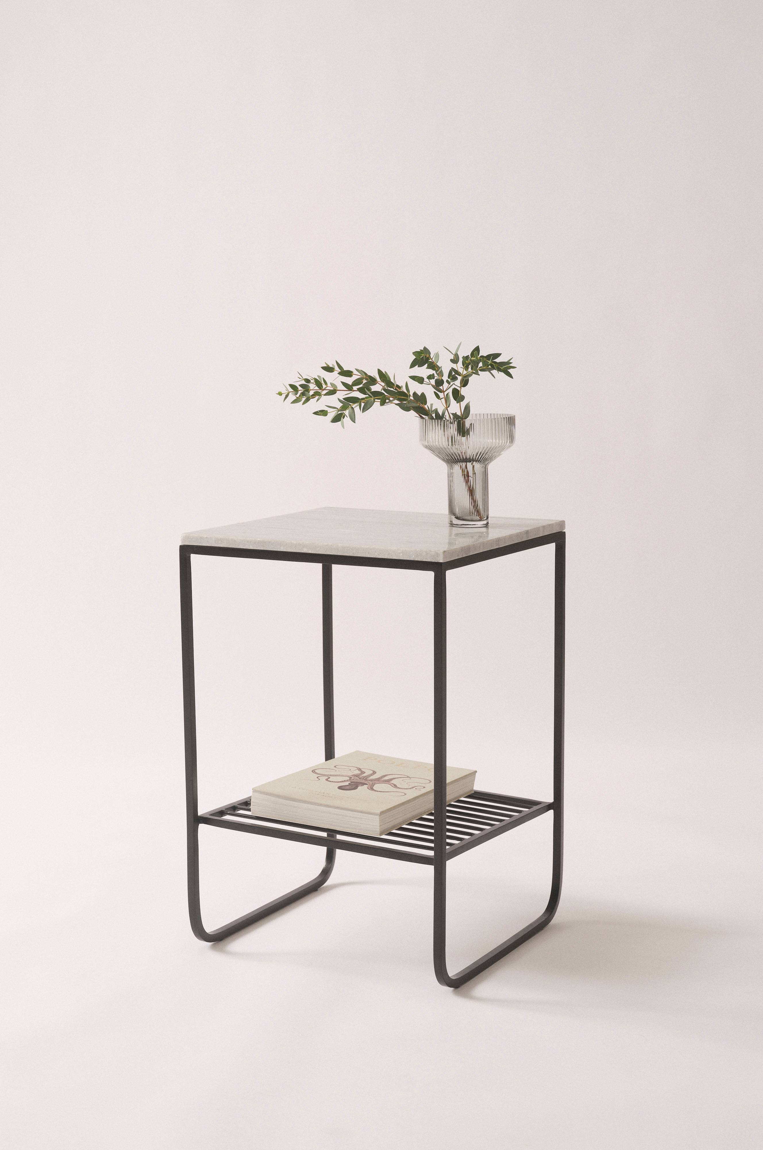 Sidebord i jern med mattlakkert overflate. Bordet har en fin bordplate av marmor og en hylle under som gir praktisk oppbevaring. Det gjør seg fint ved siden av sofaen i stua, men er også et utmerket nattbord. Stammen er av firkantprofil og bena er dekorative der de gjør en avrundet sving slik at bordet står som på meier. Marmor er en naturstein, og mønsteret varierer alltid litt avhengig av bergartens sammensetning. Dette gjør hvert møbel unikt.
