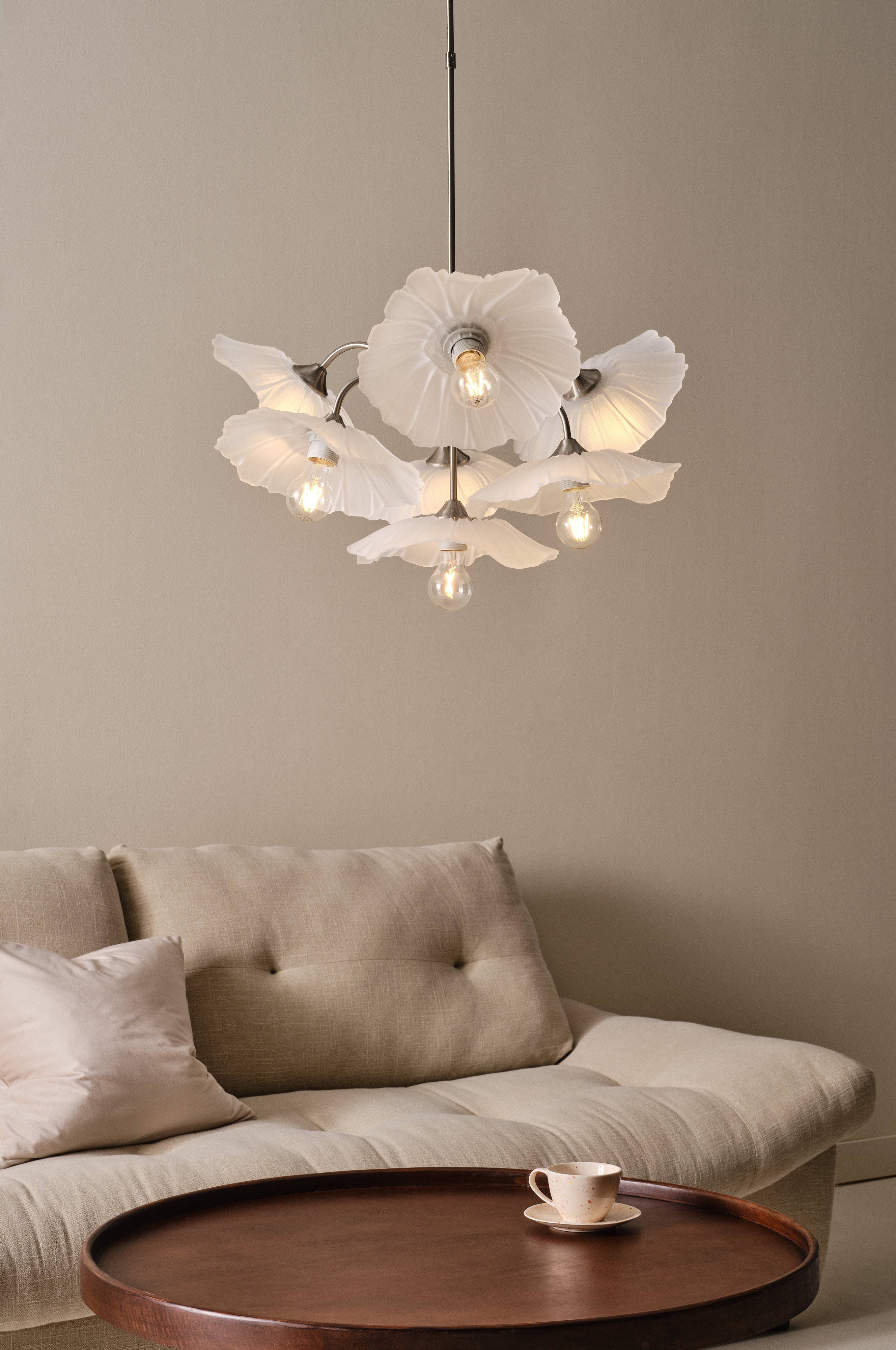NUGGET lysekrone er et fantastisk fokuspunkt for den moderne innredningen i hjemmet ditt. Med en elegant metallsokkel og syv utsøkte glassskjermer, hver og en formet som fortryllende blomster, gir denne lysekronen kunstferdig belysning og sjarm til ethvert rom. Som en del av NUGGET-familien passer den lett sammen med matchende objekter, noe som skaper et sammenhengende og elegant interiørtema.