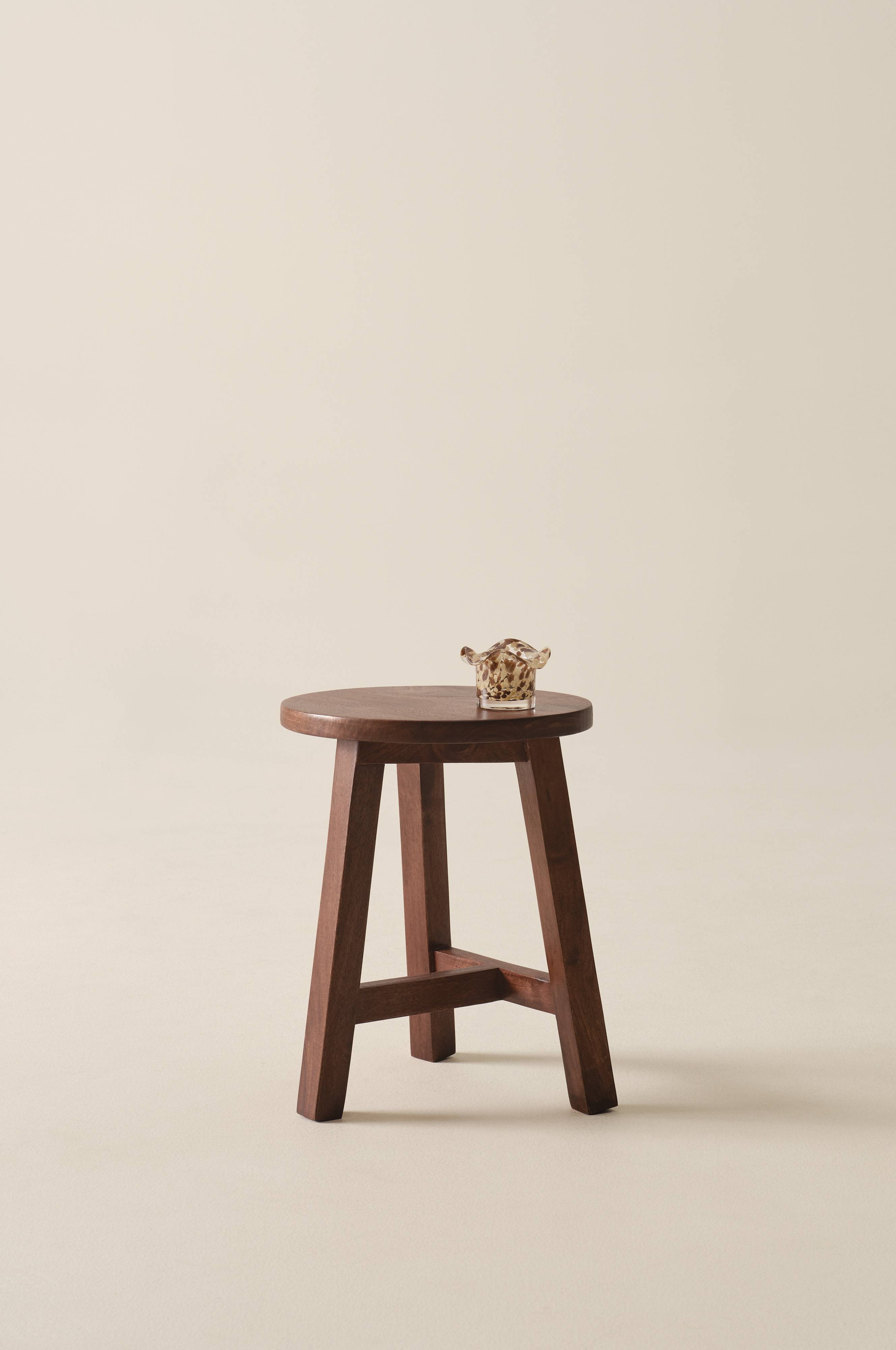 OLDEN krakk. Helt og holdent laget av mangotre. Den har en rik brunbeiset overflate. Med tre solide ben er den et stilig tilskudd til ethvert kjøkken. Denne krakken er perfekt for moderne og trendy rom og tilfører et snev av naturlig eleganse. OLDEN-krakken er allsidig og elegant, og kombinerer form og funksjon på en sømløs måte.