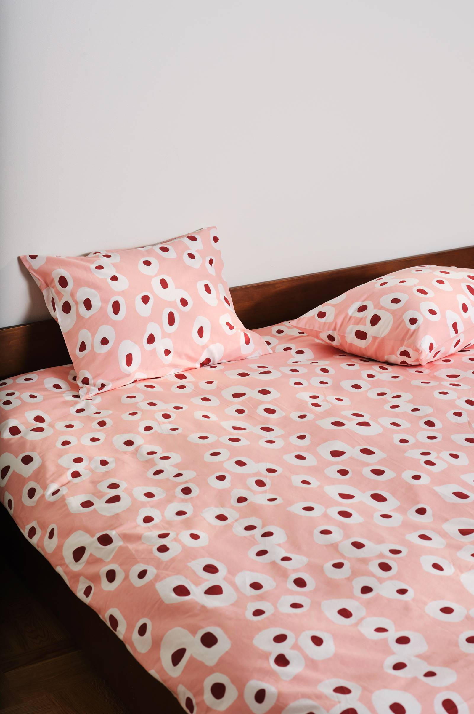 OVO dobbeltsengsett gir en leken retrostemning til soverommet ditt med sitt unike mønster designet av Maria Carlberg. Settet er inspirert av det muntre utseendet til stekte egg, og består av et ekstra bredt dynetrekk og matchende putevar. Settet er laget av økologisk bomull og har pigmenttrykk, og gjør rommet ditt både komfortabelt og kreativt. Perfekt for deg som ønsker et særegent og livlig preg på interiøret.
