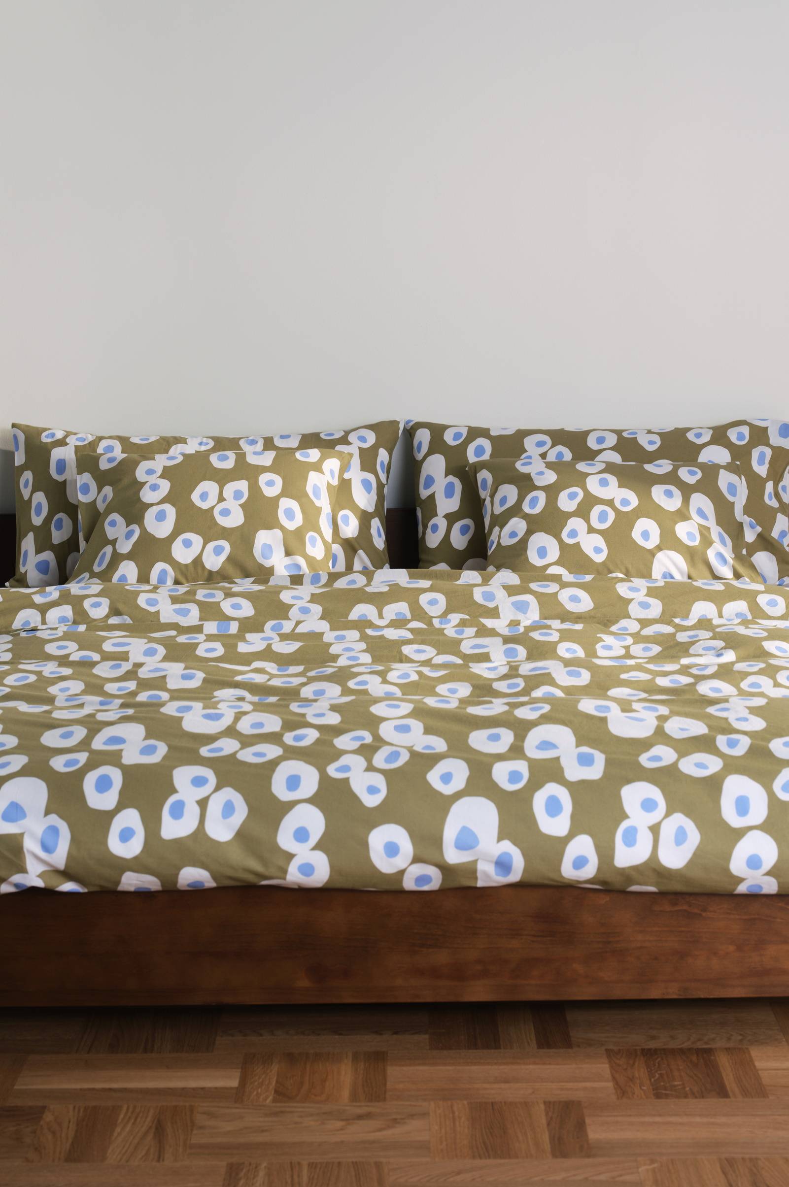 OVO dobbeltsengsett gir en leken retrostemning til soverommet ditt med sitt unike mønster designet av Maria Carlberg. Settet er inspirert av det muntre utseendet til stekte egg, og består av et ekstra bredt dynetrekk og matchende putevar. Settet er laget av økologisk bomull og har pigmenttrykk, og gjør rommet ditt både komfortabelt og kreativt. Perfekt for deg som ønsker et særegent og livlig preg på interiøret.