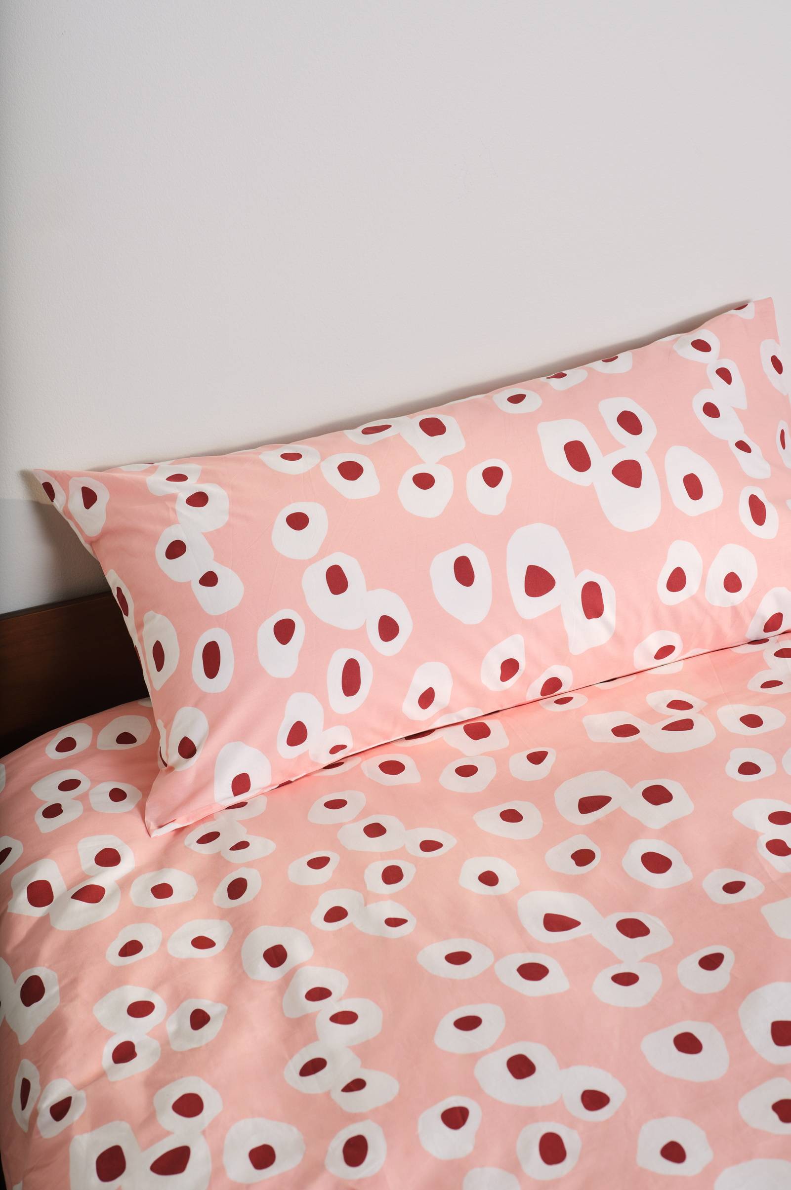 OVO-putevaret gir en leken vri til soveromsinnredningen med sitt unike mønster designet av Maria Carlberg. Det pigmenttrykte mønsteret er inspirert av stekte egg og gir en følelse av nostalgi og lekenhet til ethvert rom. Putevaret er laget av økologisk bomull og lover komfort og stil, og blander uanstrengt retro-sjarm med moderne livsstil. Med dette kunstneriske tilskuddet får du en livlig og innbydende atmosfære i hjemmet ditt.