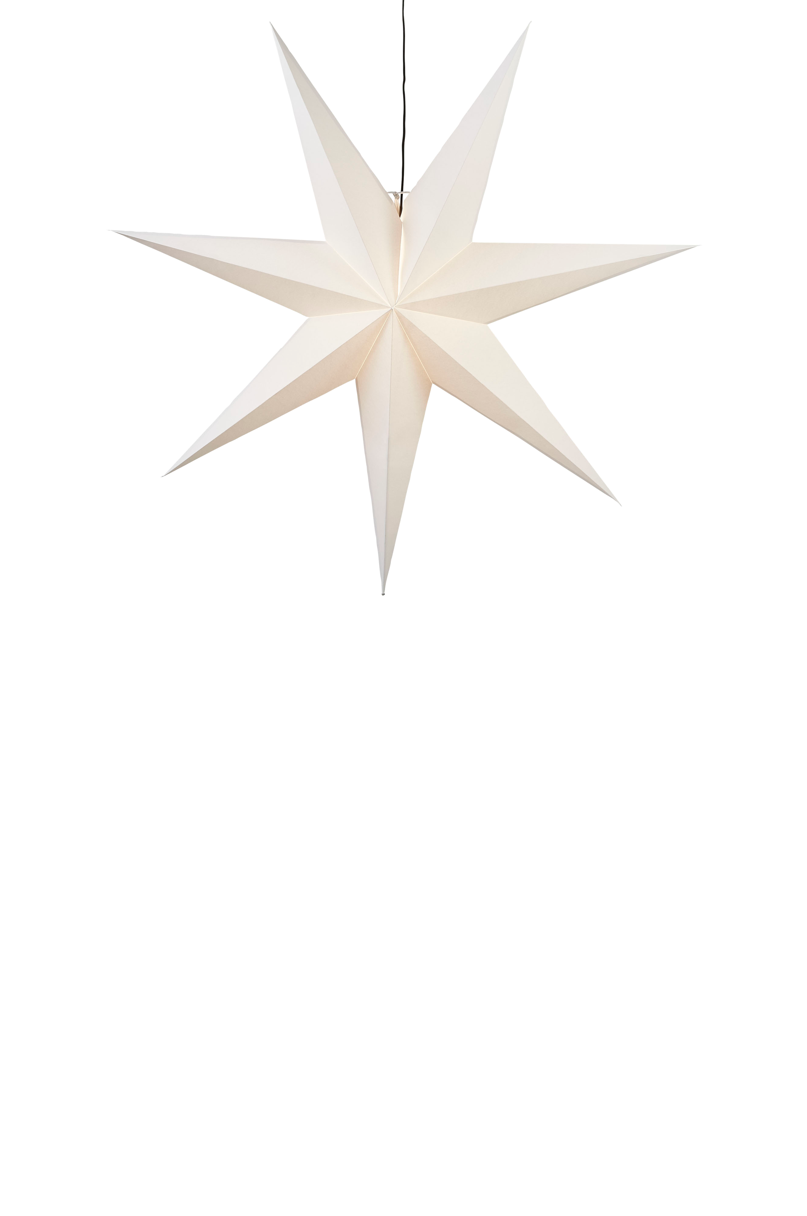 Hvit papirstjerne med svart tekstilkabel. Elegant stjerne til å dekorere med i hjemmet. Stjernen har plass til én lyskilde. Høyden er 100 cm.