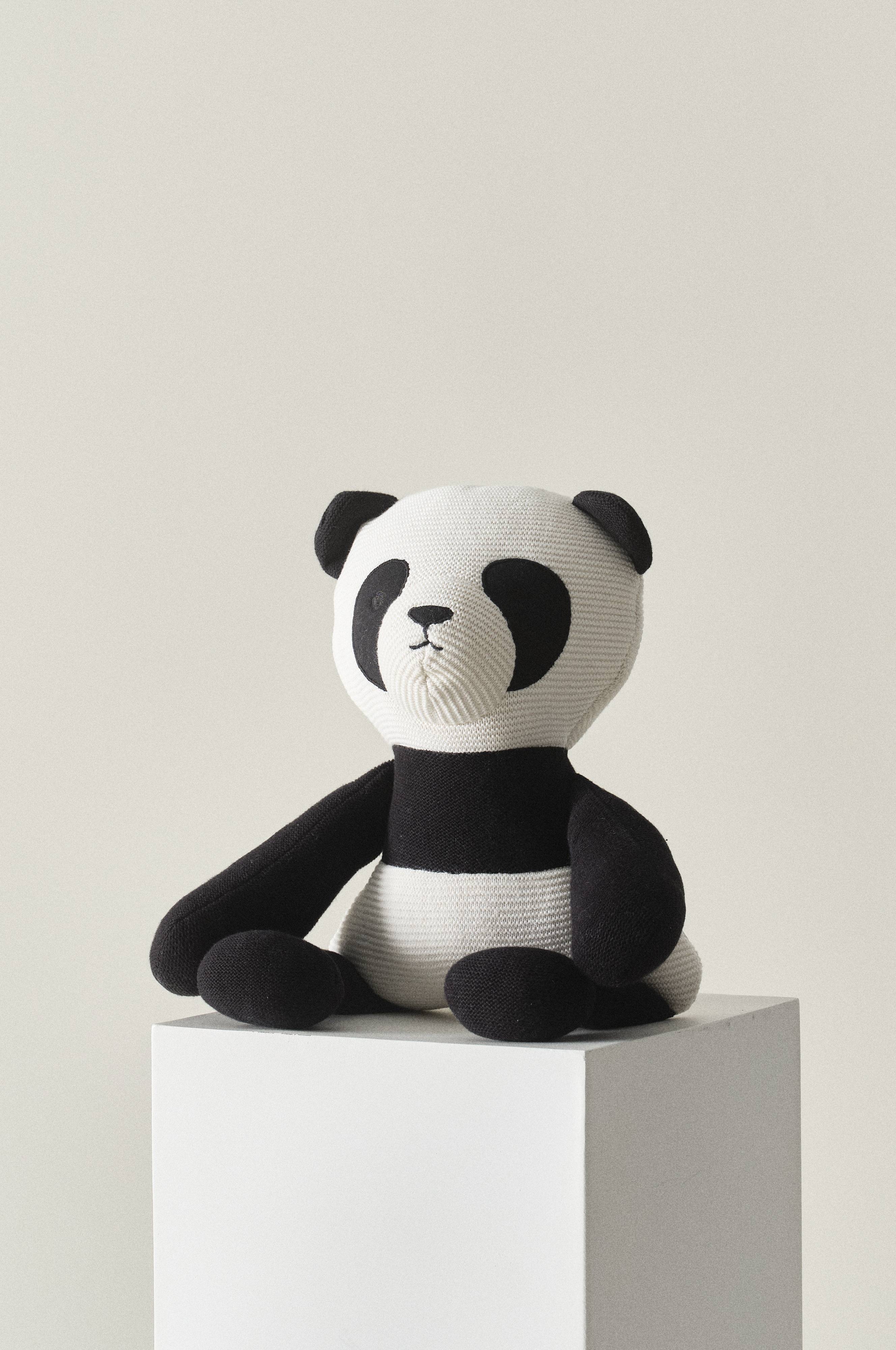 POVEL er en strikket panda i økologisk bomull som er mykt stoppet. Den søte pandaen ser vennlig og kosete ut med sin åpne favn. POVEL er dessuten trygg for barn. Det innebærer at alle sømmer er testet og drasikre, og at materialene er ild- og flammesikre samt uten giftige stoffer. Produktet er CE-merket. Det betyr at leken oppfyller kravene i gjeldende EU-lover.