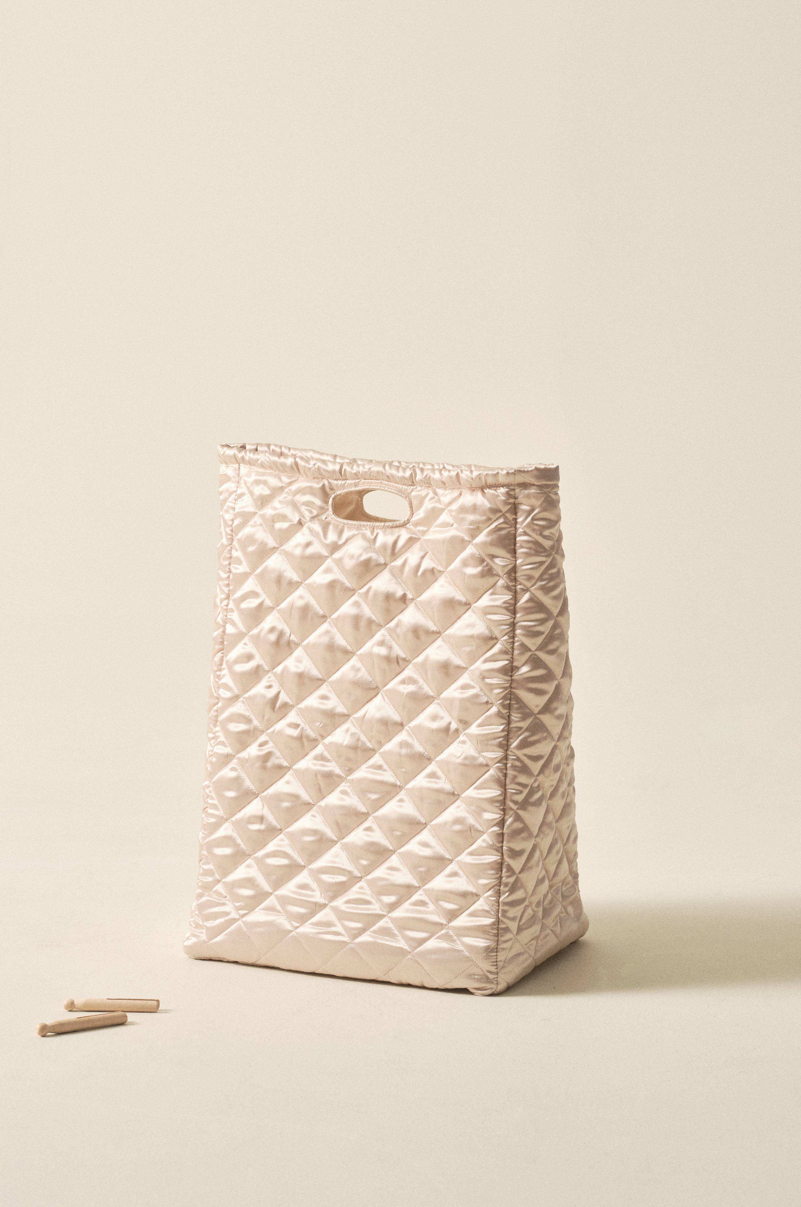 Vevd skittentøyskurv i blank, rutequiltet polyester av gjenvunnet materiale. REEDY er elegant og praktisk på samme tid, så nå kan du oppbevare skittentøyet på en elegant måte. Håndtak øverst gjør skittentøyskurven enkel å flytte og bære med til vaskerommet. Skittentøyskurven har fôr av bomull og fyll av polyester. Hard ramme av plast og hard bunnplate gjør at den står av seg selv og blir dekorativ på for eksempel badet.