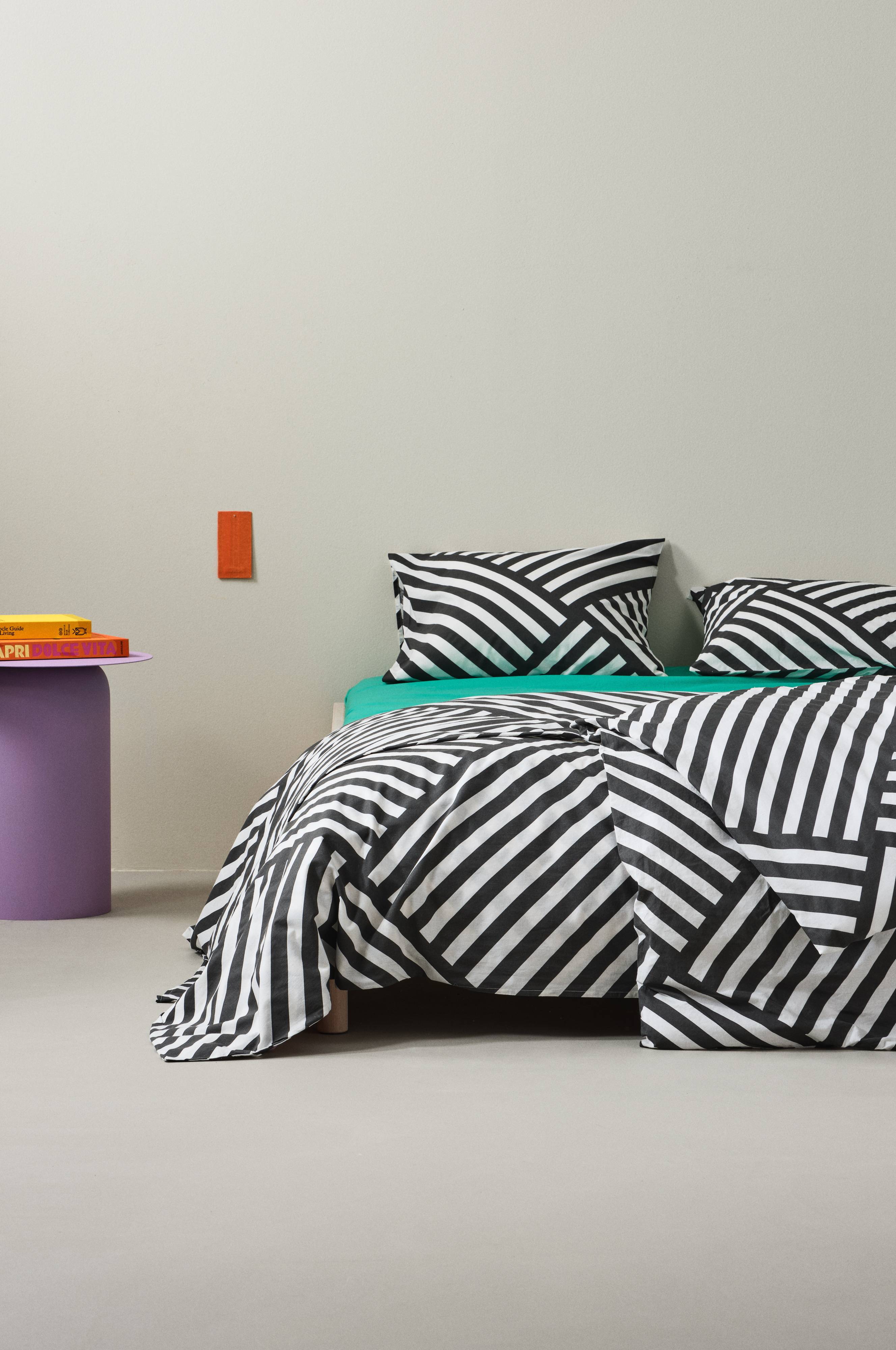 Sengesett i to deler med et dynetrekk og et putevar av bomull med trykt, geometrisk stripemønster. Sengetøyprogrammet RIMA er plaggvasket for å bli ekstra mykt og deilig. Åpning øverst i hjørnene på dynetrekket. Det gjør det lettere å tre dynetrekket over dynen. Trykknapper for lukking av dynetrekket. Trådtetthet på 144 tc. (Trådtettheten forteller om antallet tråder, thread counts, pr. kvadrattomme i et stoff. Jo høyere trådtetthet, desto høyere kvalitet.)