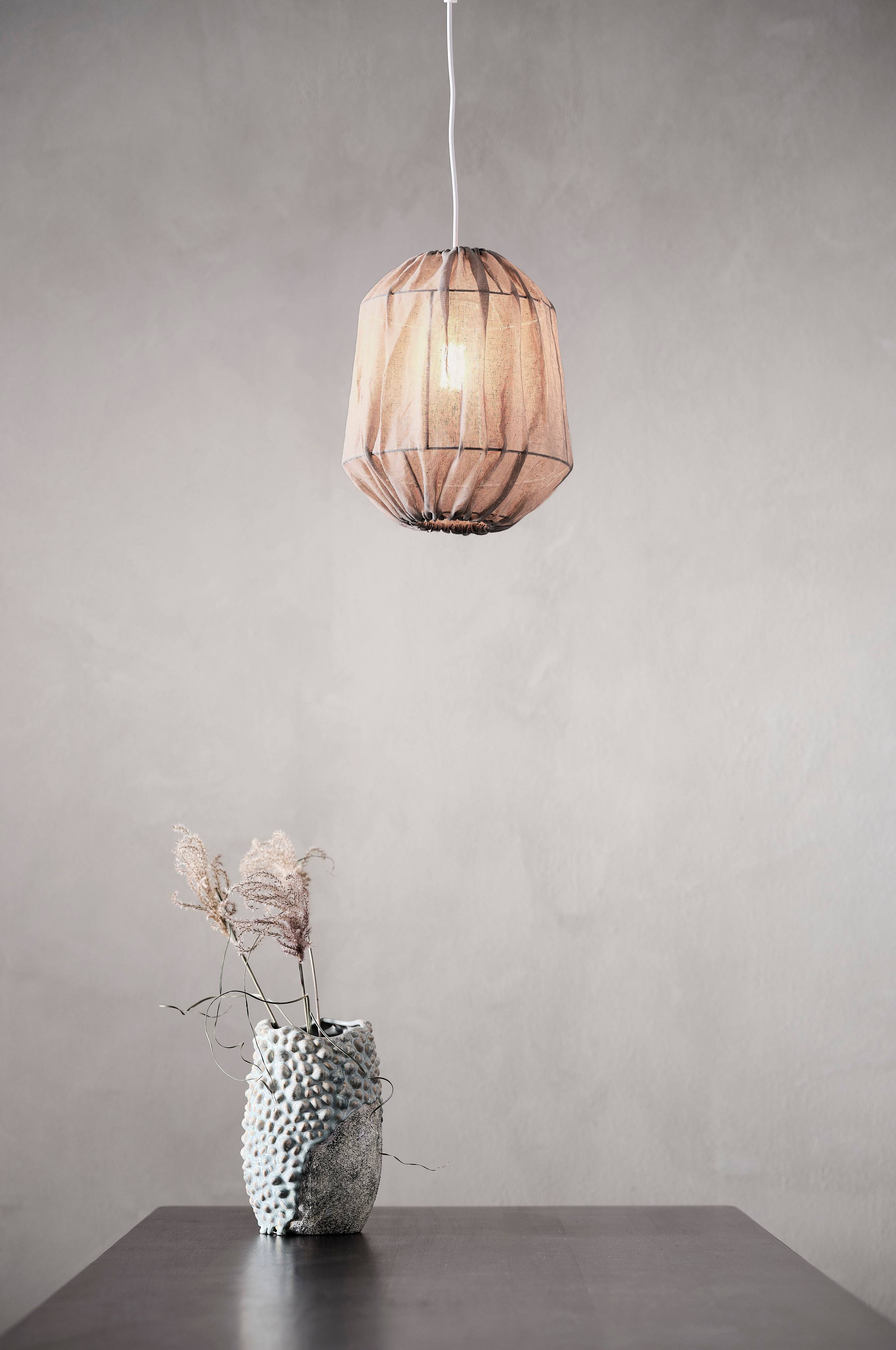 Taklampe i fint linstoff som sprer et koselig lysskinn når lampen lyser. Lin er et naturmateriale som gir en rustikk og jordnær følelse. Hvit ledning, ledningslengde 1,1 m.