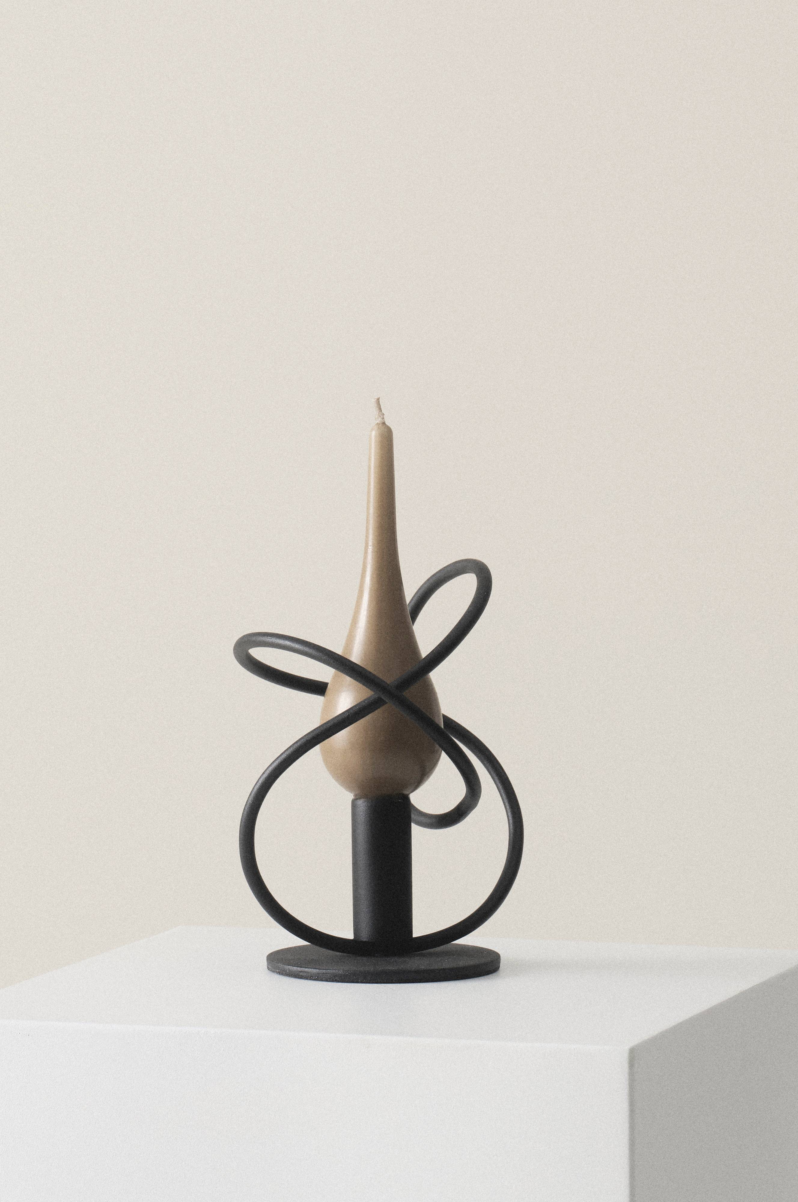 Lysestake av jern. Lysestaken har lekker, uregelmessig form, og står stabilt på en rund fot. Den svarte har matt, pulverlakkert overflate, den sølvfargede har børstet finish. Lys medfølger ikke.