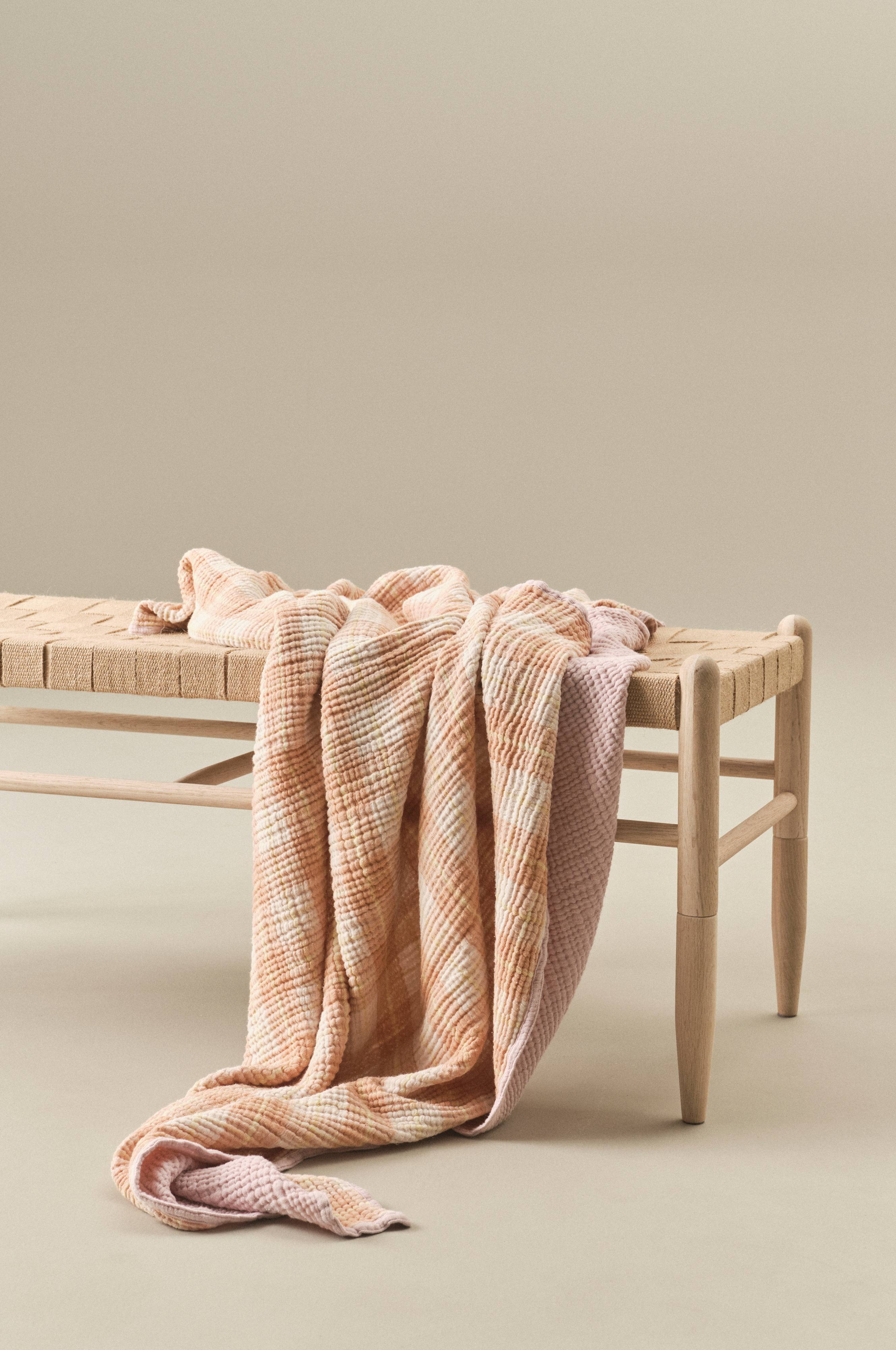 RUTHY er et herlig og luftig pledd i musselinkvalitet av bomull med båndkant rundt. Musselin er en deilig kvalitet som vevd i flere lag. RUTHY har fire lag, og blir bare mykere jo mer det brukes. Pleddet er garnfarget, noe som betyr at garnet er farget før veving. Pleddet har rutete tekstur. RUTHY er akkurat passe tykt og varmer deilig, mye takket være luften som skapes i den spesielle veveteknikken. Gramvekt 210 g/m².