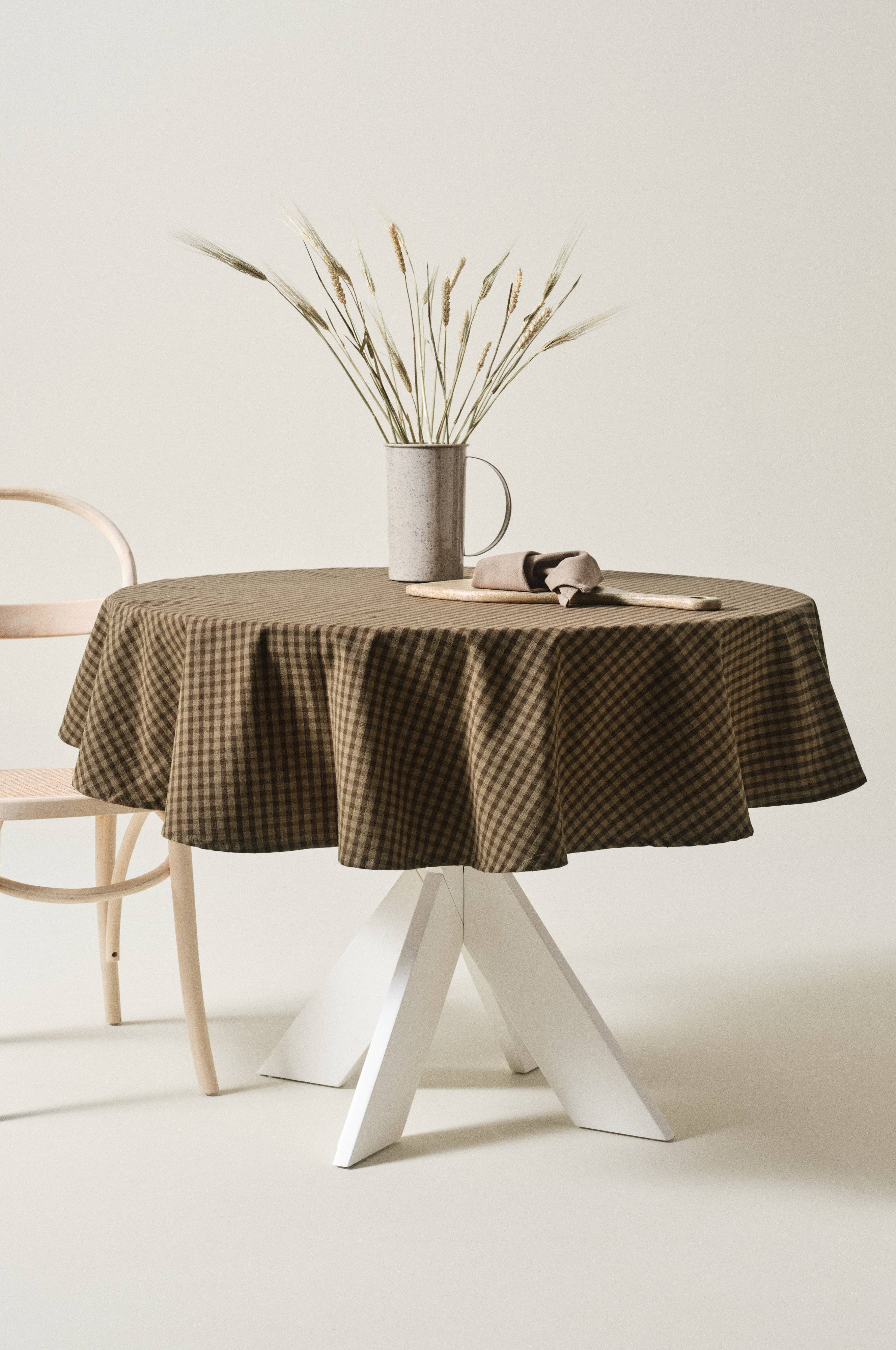 Rund duk i litt kraftig bomull med vevd, smårutete mønster i fine nyanser. RYLIE har klassiske ruter som er lett å like og som passer til det meste.