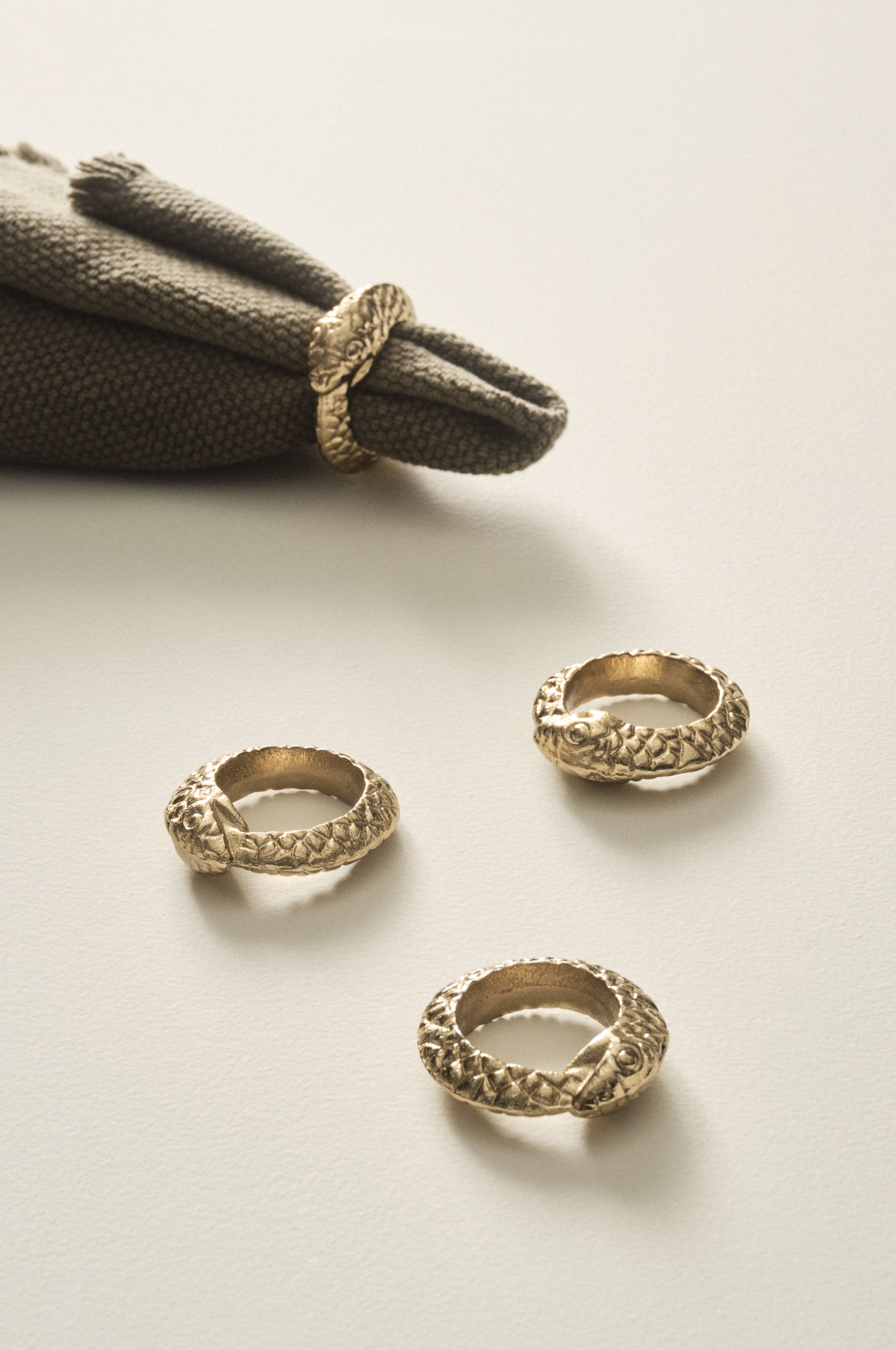 4-pk serviettringer i aluminium. Serviettringene er formet som en slange som slynger seg rundt servietten, og de har et vakkert, preget mønster. Messingfargen gjør serviettringene ekstra fine.