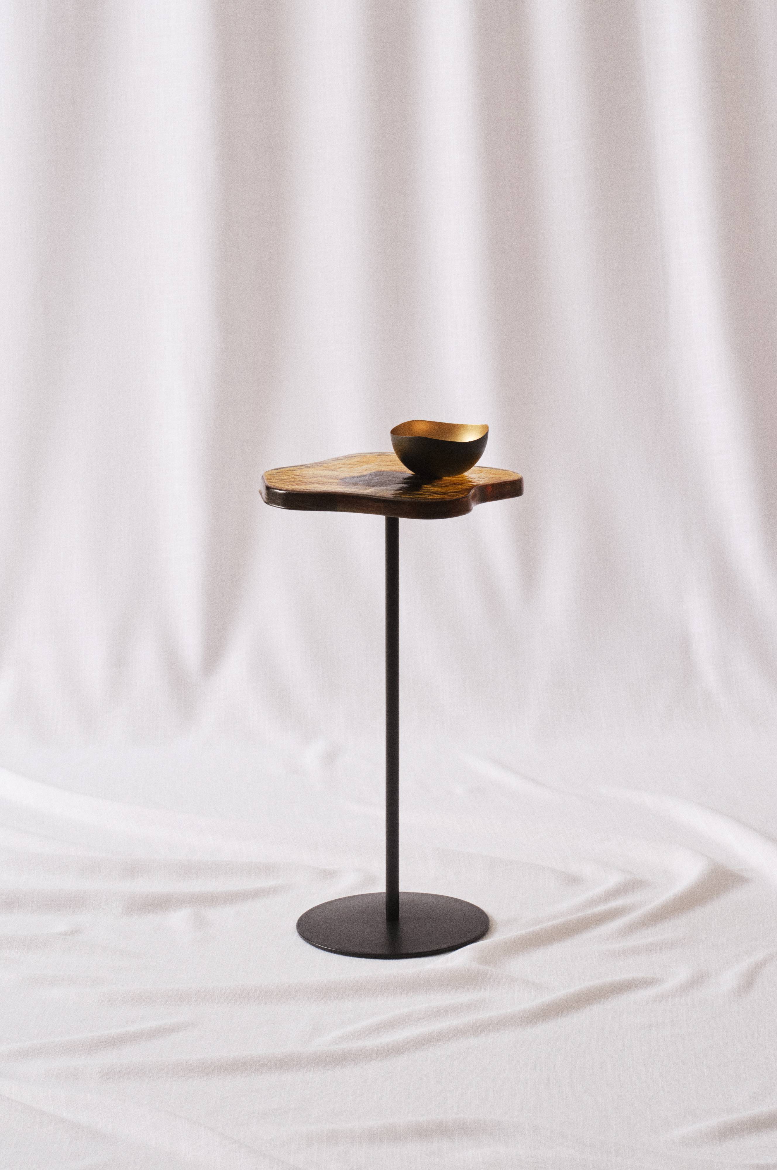 SAKSUN er et nett, stilig sidebord med søylefot av jern. Der hviler en vakker, lett transparent bordplate av ravfarget glass. Bordplaten har bølgende og uregelmessig form, og fargen er magisk med lett tekstur som gjør at fargen skimrer. Foten har pulverlakkert overflate.