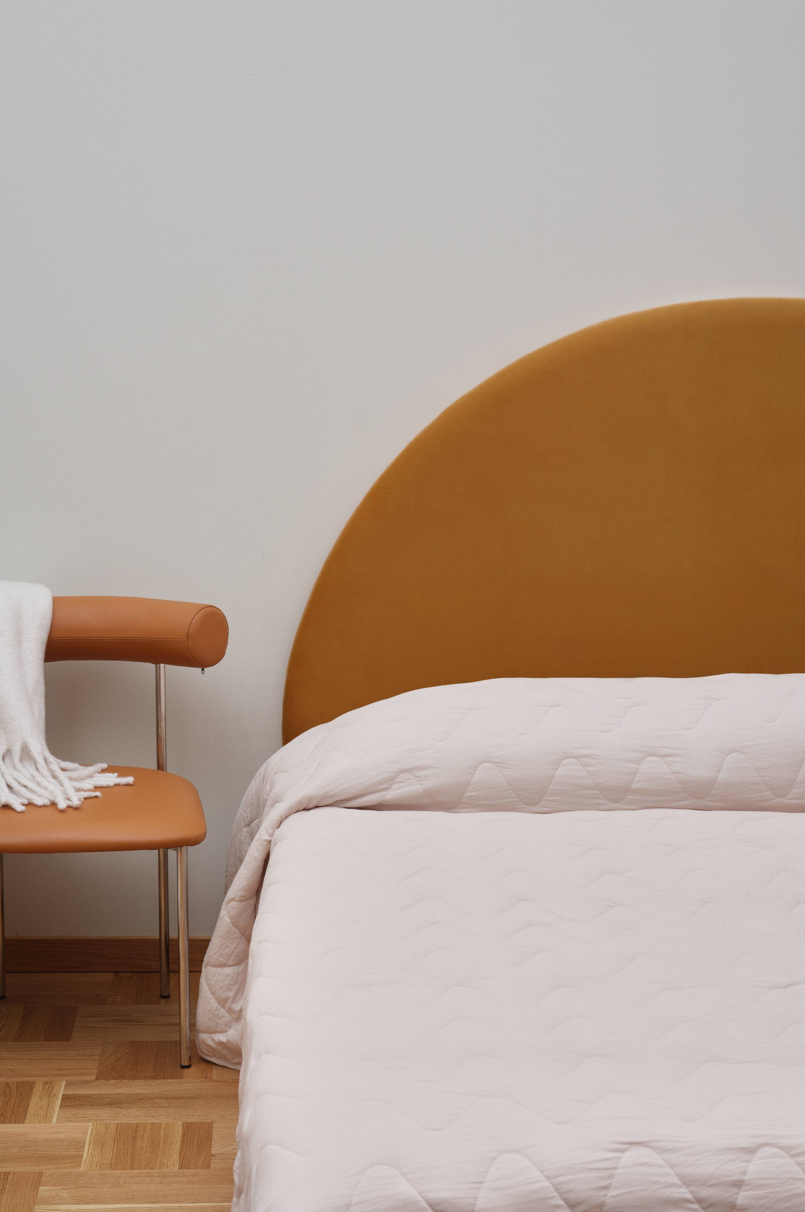 SAMI sengegavl har et retroinspirert preg med sin halvsirkelformede design. Den er laget med et trekk i fløyelsstoff og skumgummipolstring. Denne minimalistiske sengegavlen kan enkelt monteres på veggen, noe som gjør den til et ideelt valg for deg som ønsker enkelhet og eleganse i soveromsinnredningen. SAMI-sengegavlen er en perfekt blanding av komfort og vintage-sjarm, og er designet for å forbedre ethvert soverom.