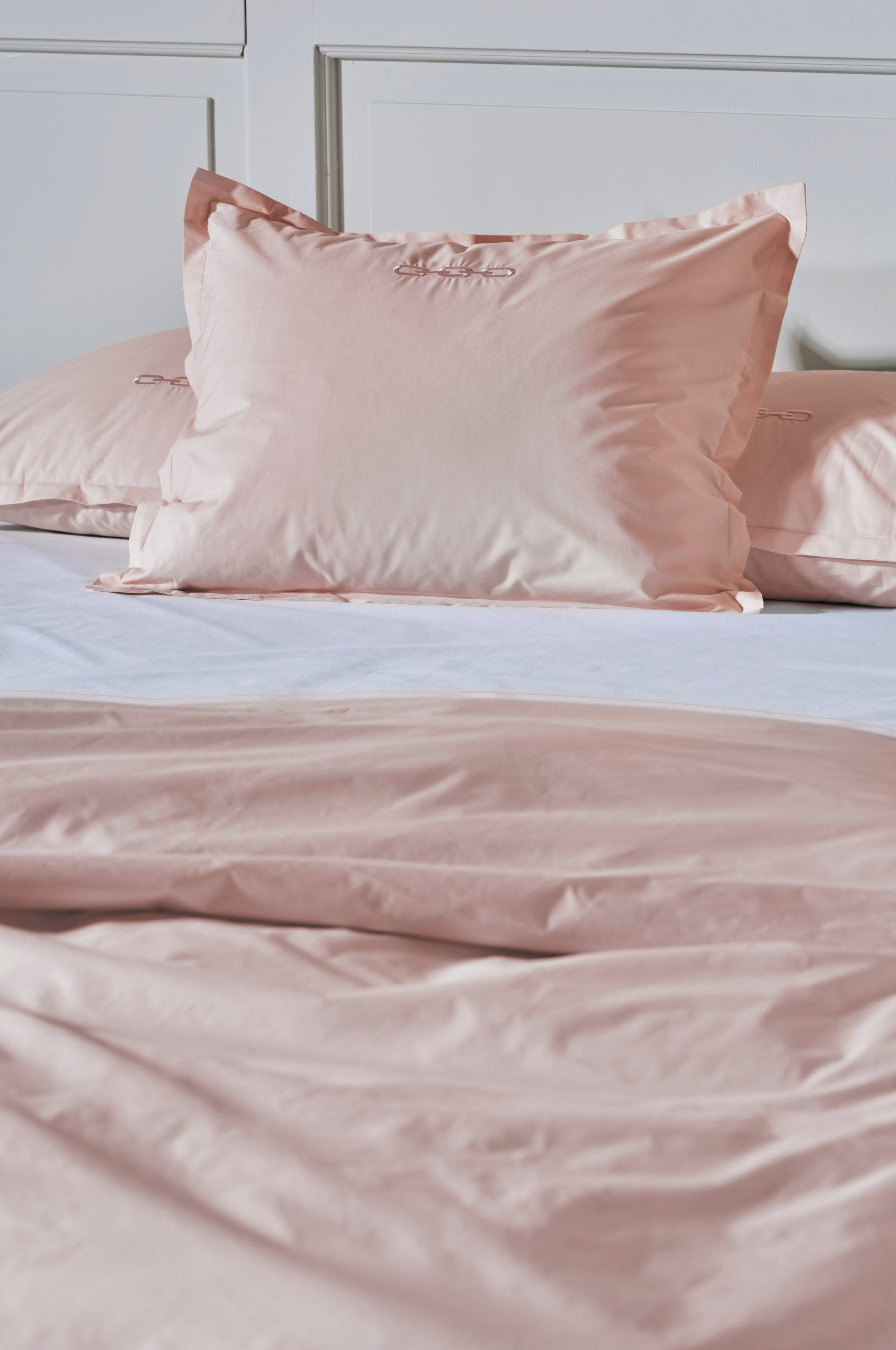Putevar i ensfarget bomullspercale med brodert mønster. Trådtetthet på 200 tc. (Trådtettheten forteller om antallet tråder, thread counts, pr. kvadrattomme i et stoff. Jo høyere trådtetthet, desto høyere kvalitet).