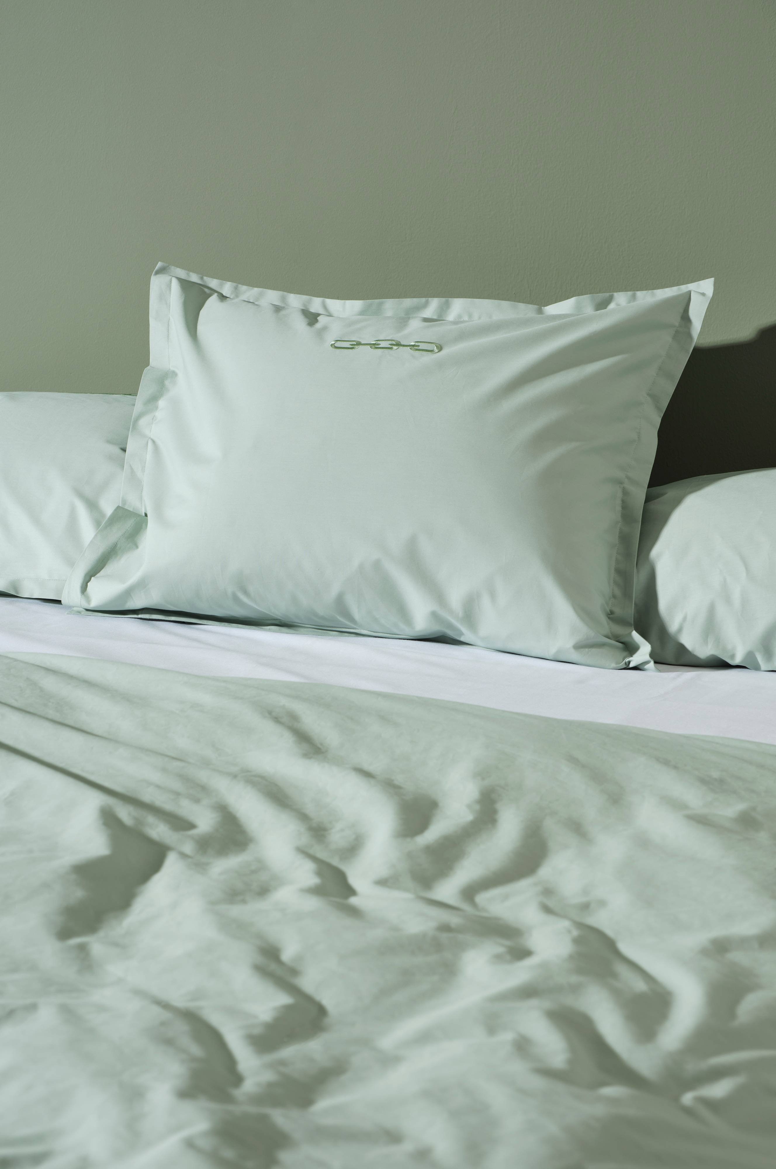 Putevar i ensfarget bomullspercale med brodert mønster. Trådtetthet på 200 tc. (Trådtettheten forteller om antallet tråder, thread counts, pr. kvadrattomme i et stoff. Jo høyere trådtetthet, desto høyere kvalitet).