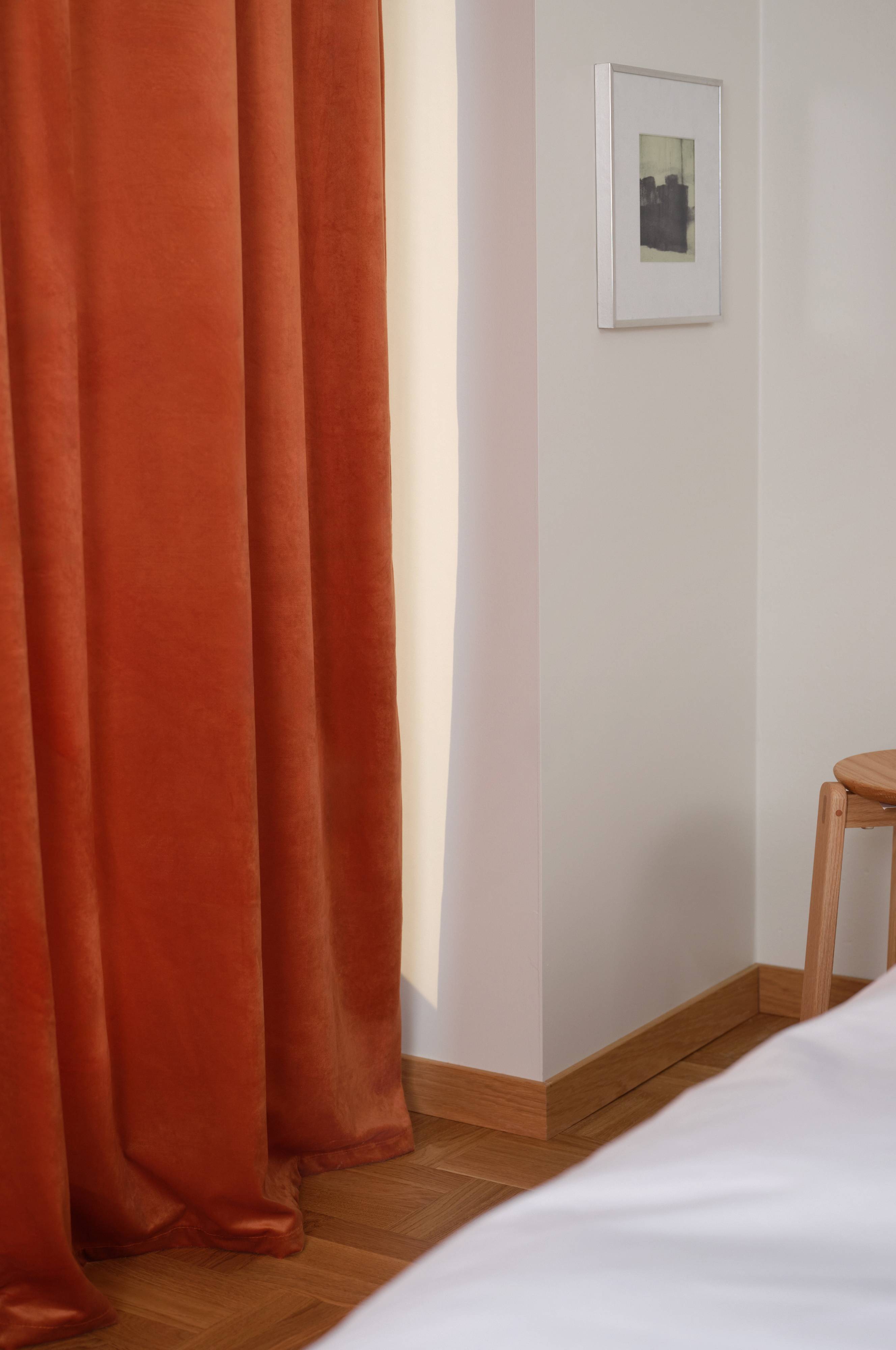 En gardinlengde i ensfarget polyesterfløyel. Fløyel har en fin glans og en myk følelse, og fargen skimrer vakkert i ulike lys.