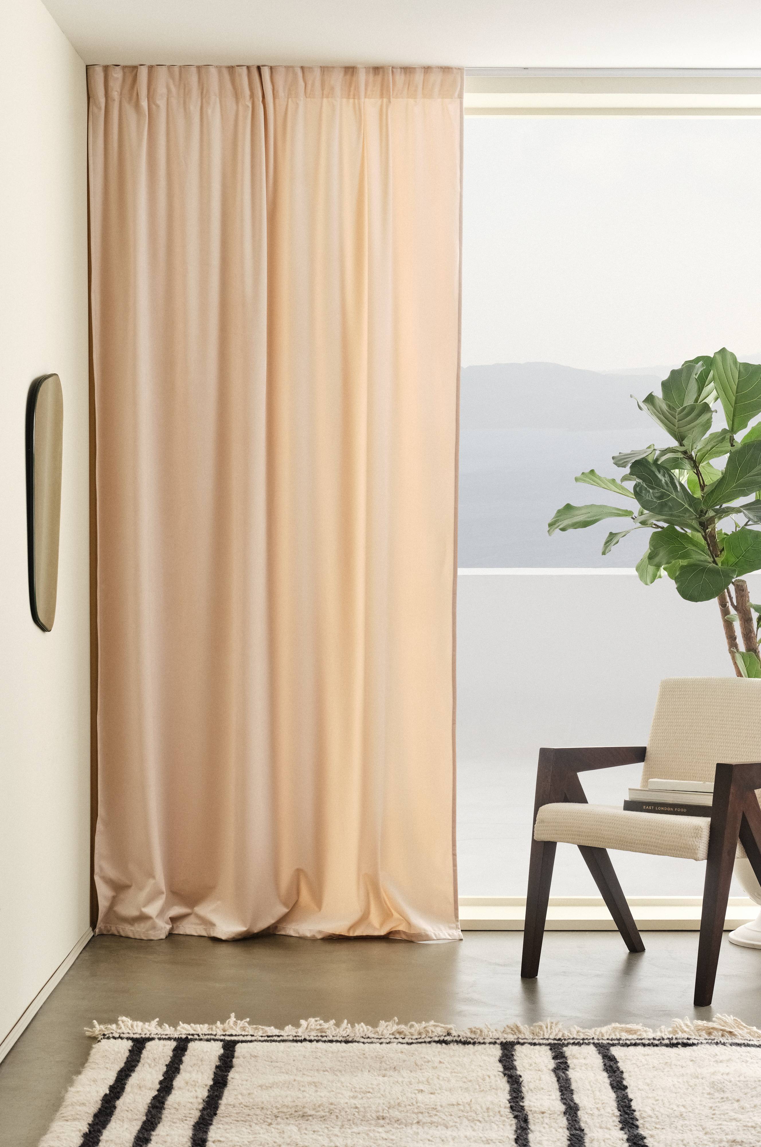En gardinlengde i ensfarget polyesterfløyel. Fløyel har en fin glans og en myk følelse, og fargen skimrer vakkert i ulike lys.