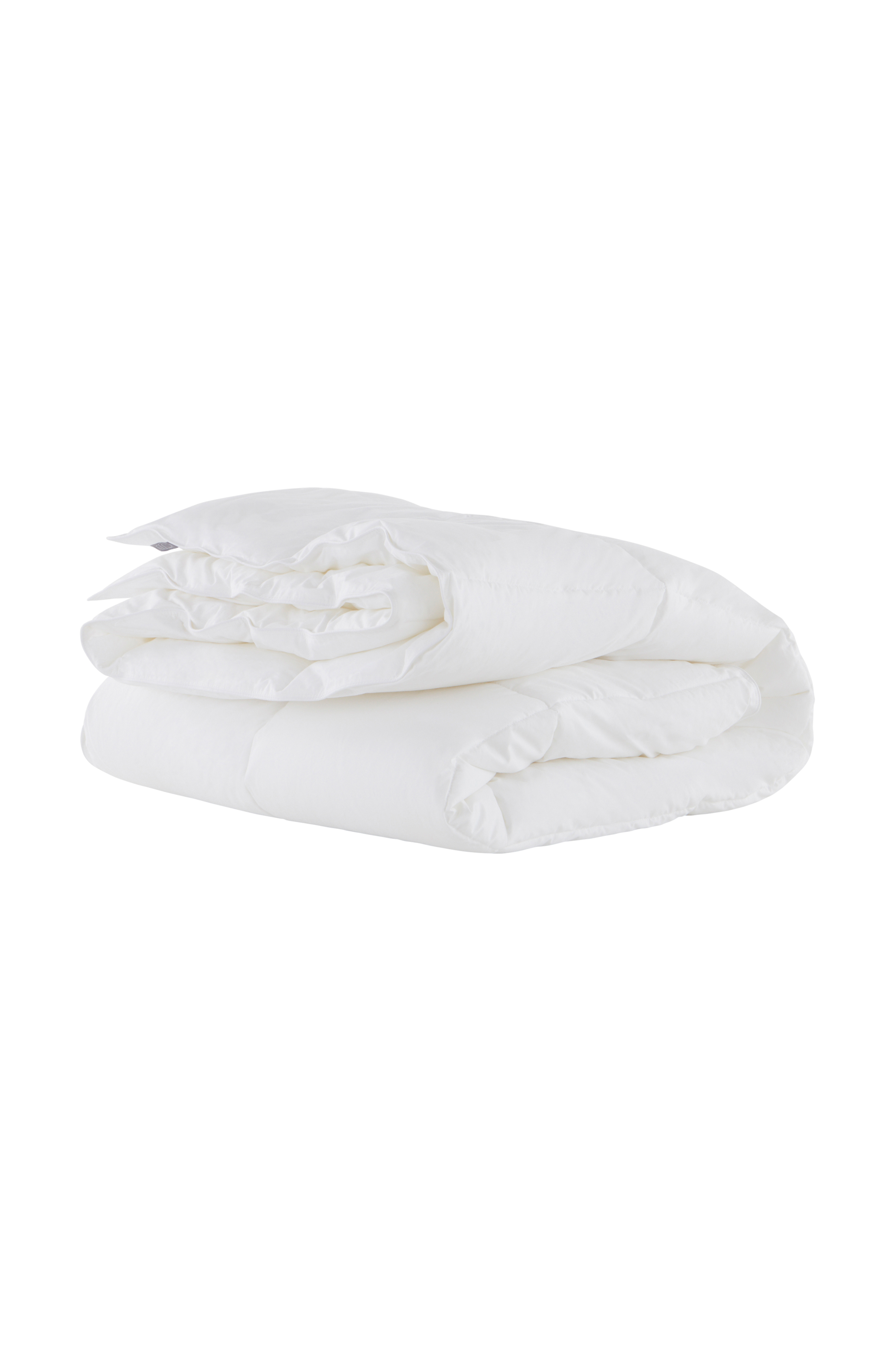 Enkeltsengsdyne av bomullspercale med syntetisk fyll av plast hentet fra havet. Dynen er kvadratisk quiltet og har påsydd mellomlegg for å holde fyllet på plass. Dynen er forkrympet og krymper derfor ikke i vask. .