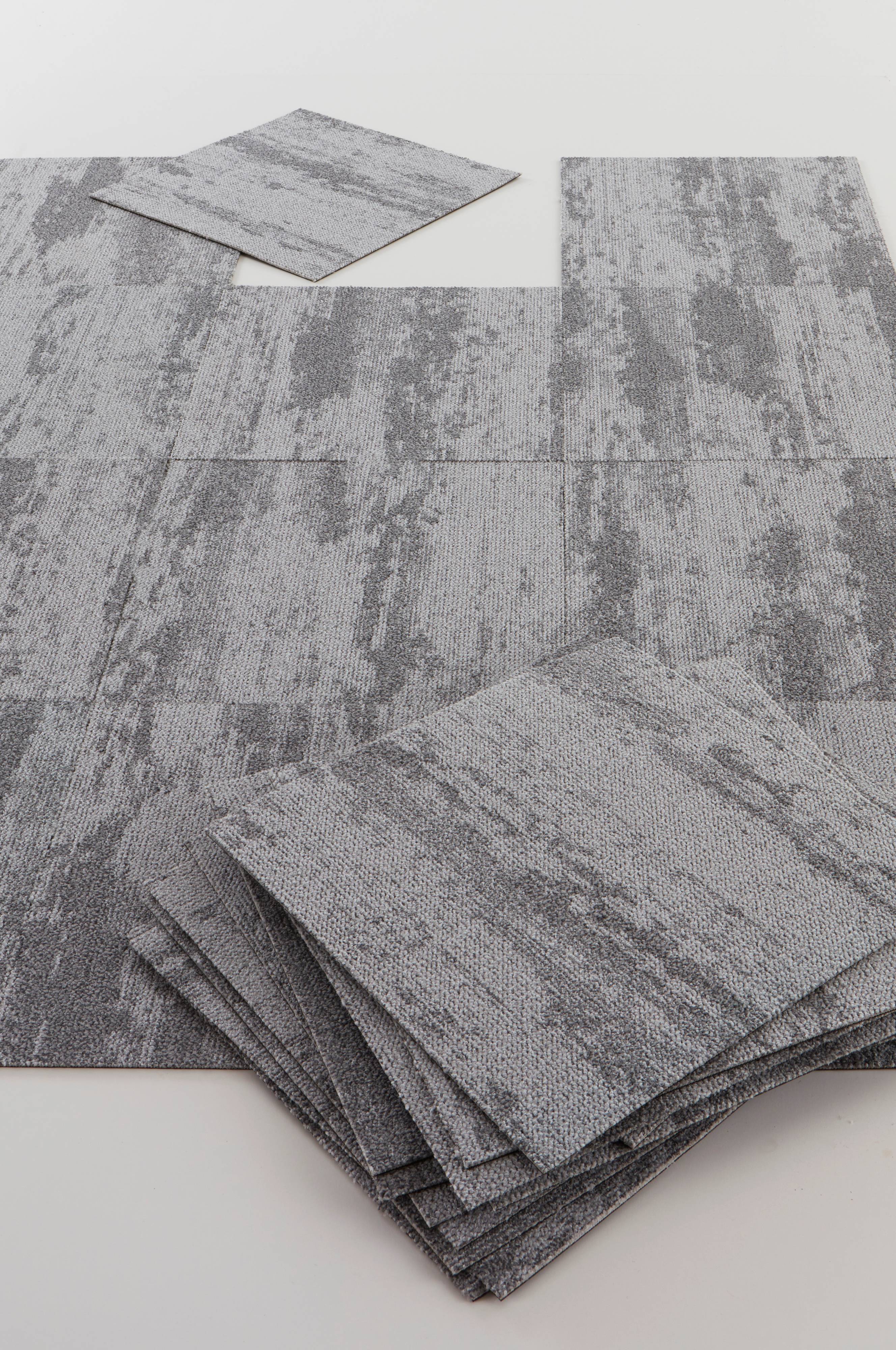 Tekstilflisene legges kant i kant på gulvet og festes enkelt med selvklebende bakside. Hvis de skal formes for å passe mot veggen, en åpning, søyle eller lignende, skjærer du flisen i riktig form med en teppekniv. Med tekstilfliser er det enkelt å skape spennende mønstre ved å kombinere ulike farger og skape sjakkruter, striper eller et annet mønster. Lugghøyde 0,7 cm. 4400 g/m².