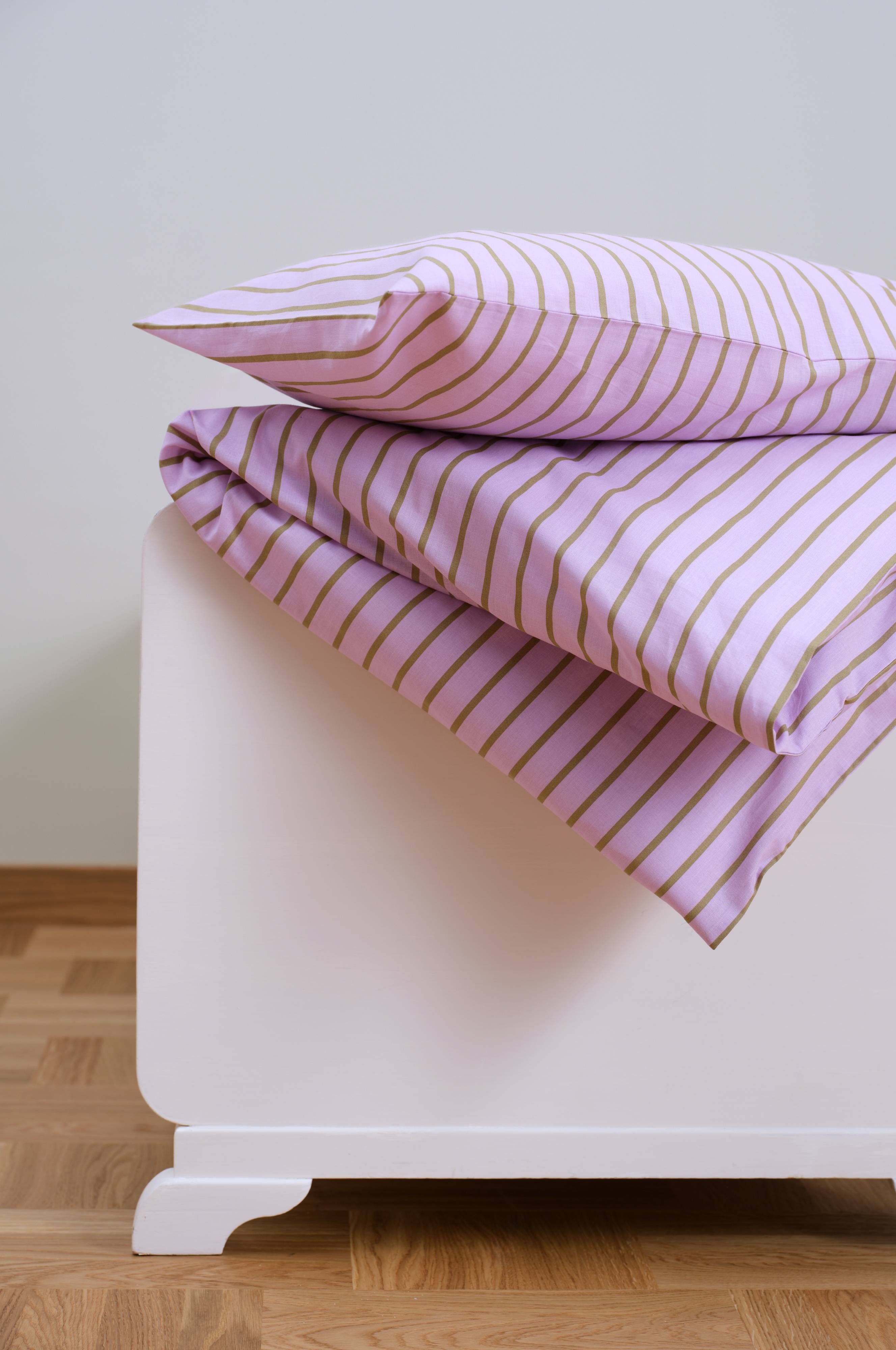 SIMAs dynetrekk i økologisk bomull er skreddersydd for å passe perfekt til barnesengen og gir en myk følelse når den lille skal sove. Trykte striper i friske farger.
