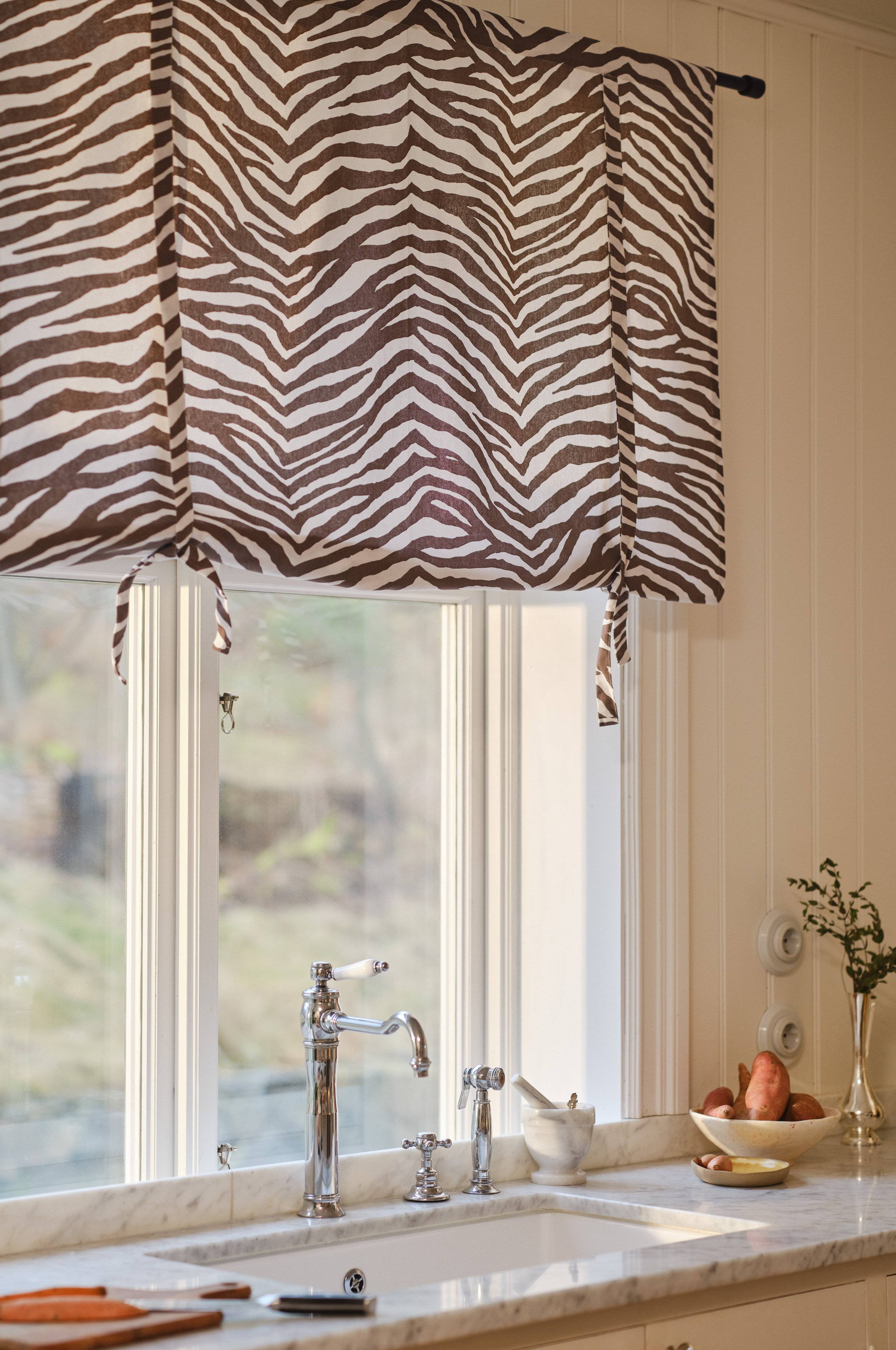 SIMBA rullegardin med et elegant sebra-mønster gir en moderne vri til ethvert rom, enten det er kjøkken, soverom eller stue. Den er laget av bomull og har to knytebånd som gjør det mulig å justere lengden for skreddersydd passform. Perfekt for deg som ønsker moderne sjarm og praktisk funksjonalitet i interiøret.