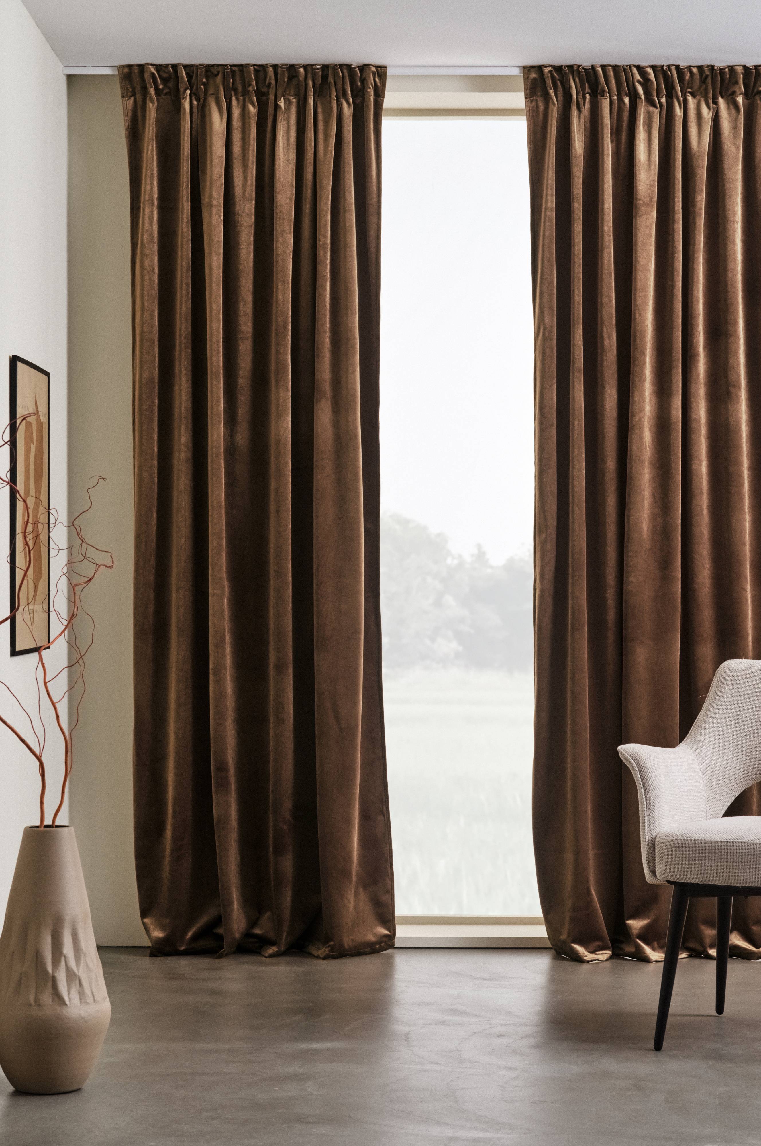To gardinlengder i elegant fløyel av polyester. Fløyelen skimrer vakkert. Fargenyansen oppleves ulik avhengig av hvordan lyset faller. Lengden har påsydd multifunksjonsbånd. Gardinen kan henges opp med fingerkroker, løpegang samt skjulte hemper.