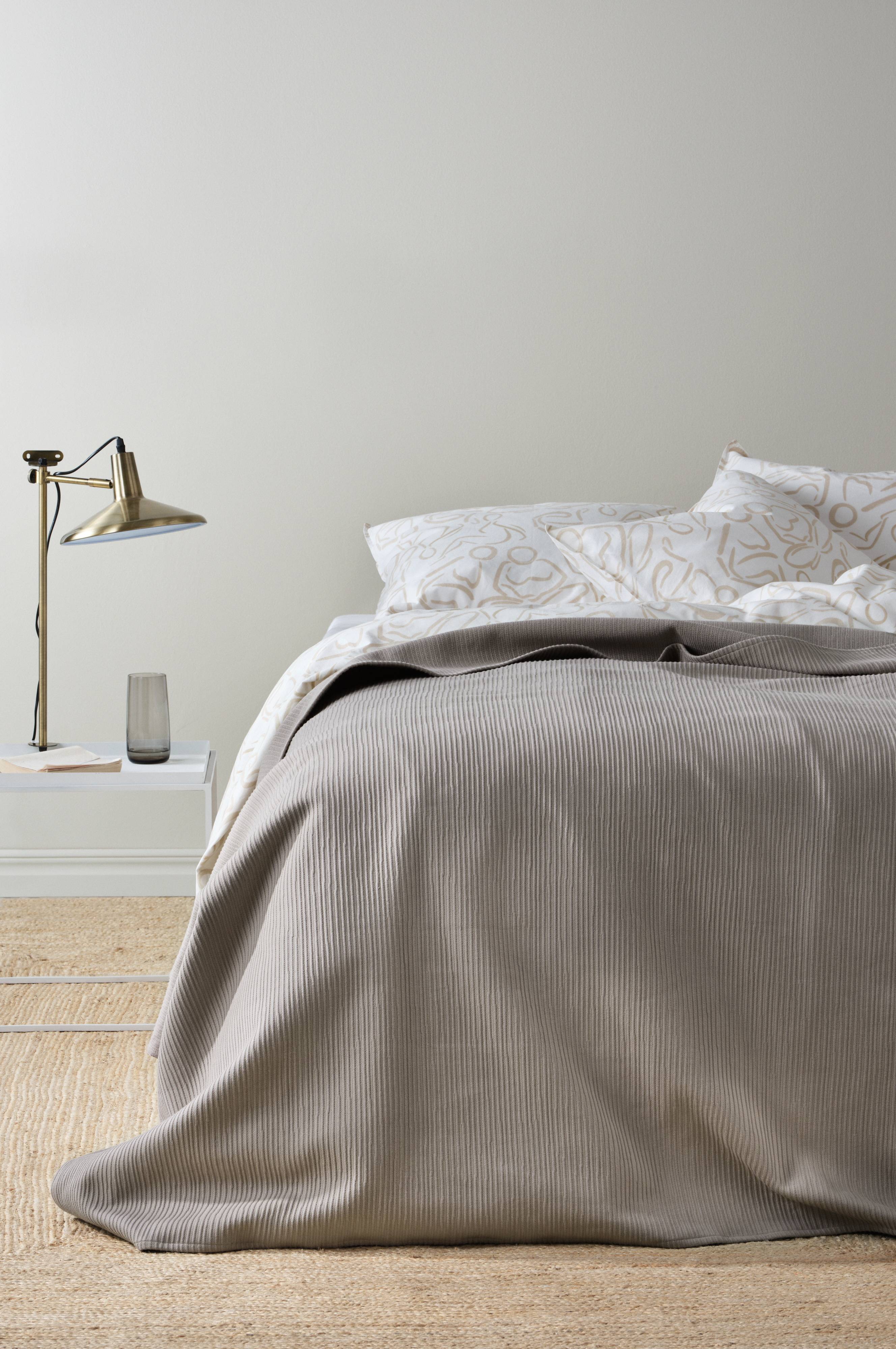 Sengeteppe for dobbeltseng. SIMPLU er et smidig, strikket sengeteppe som i sin enkelhet gir en tidløs og behagelig oppredd seng. Strikkemetoden gir stripemønster ton-i-ton, med diskre tekstur. Det behagelige bomullsstoffet har en gramvekt på 430 g/m². Det er deilig å ta en liten blund oppå sengeteppet. Putetrekk medfølger ikke, kjøpes separat.
