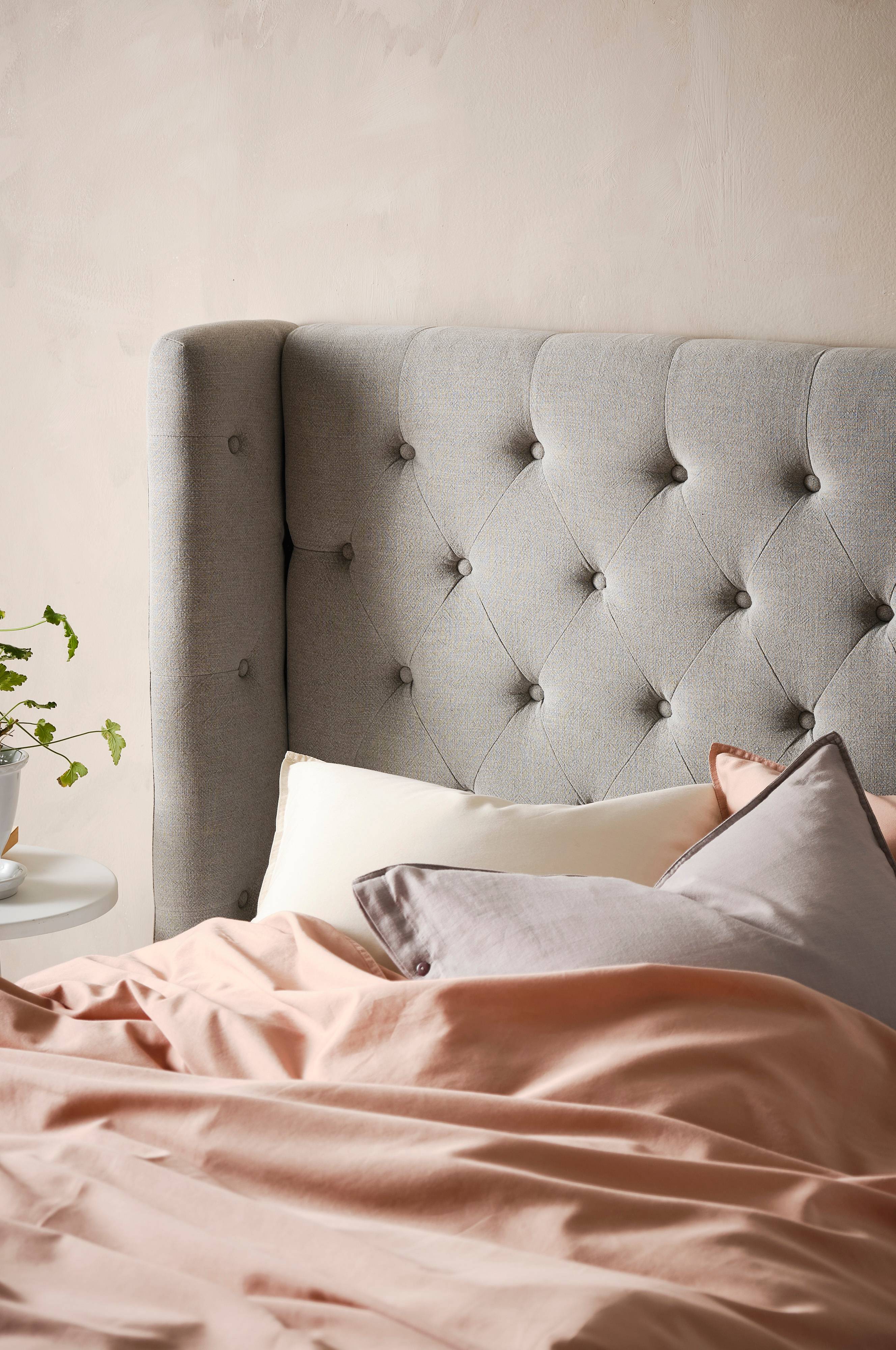 Frittstående gavl trukket med lin og med dypt heftede, kledde knapper. Kan også henges på veggen. Skap en luksuriøs hotellfølelse hjemme med en dypt heftet sengegavl med vinger.