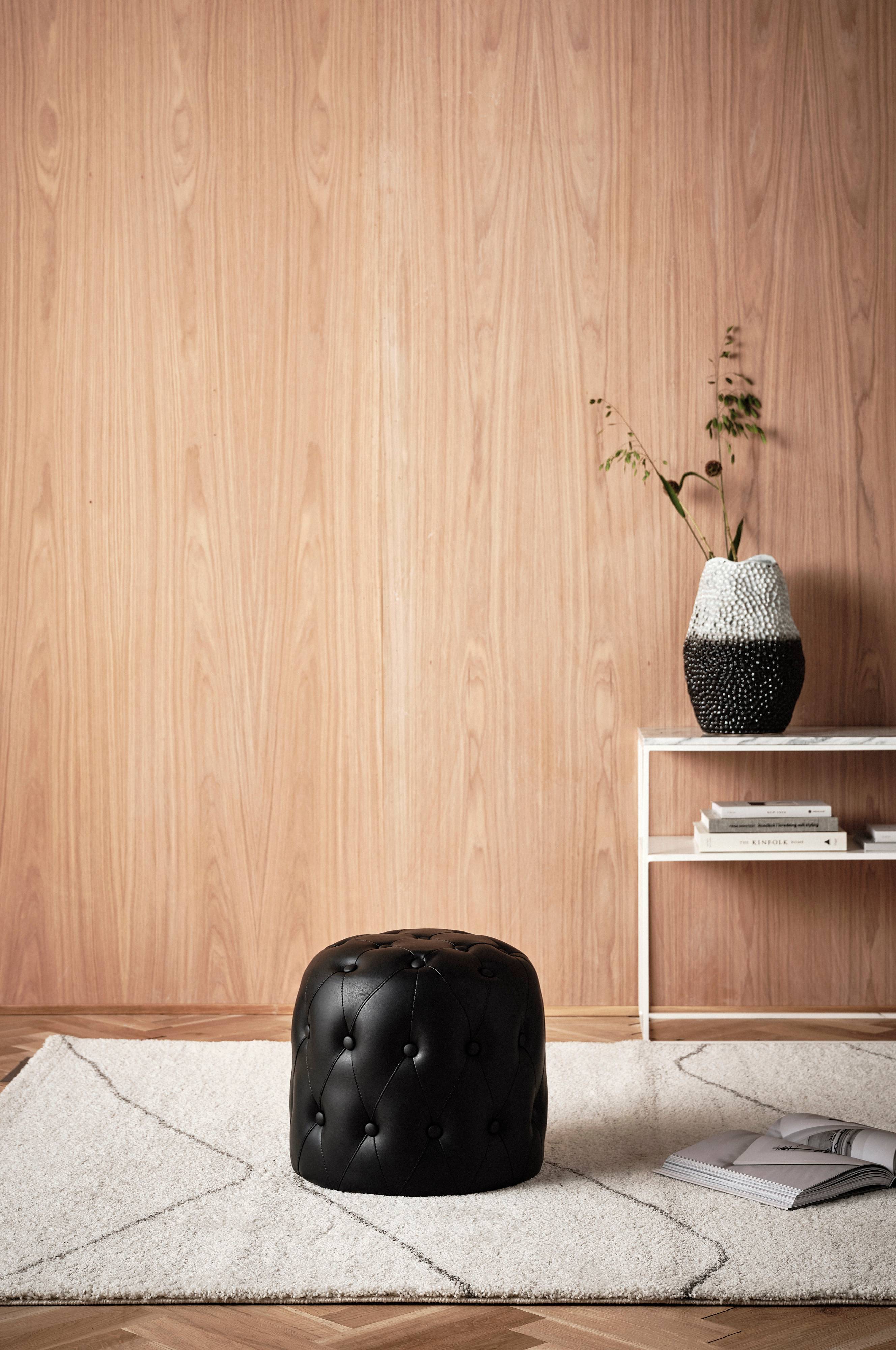 Beskrivelse: Sittepuff med dypt heftede og kledde knapper. Kombinasjonen av sikksakkfjærer, springfjærkjerne og skumgummifyll gir maksimal sittekomfort.