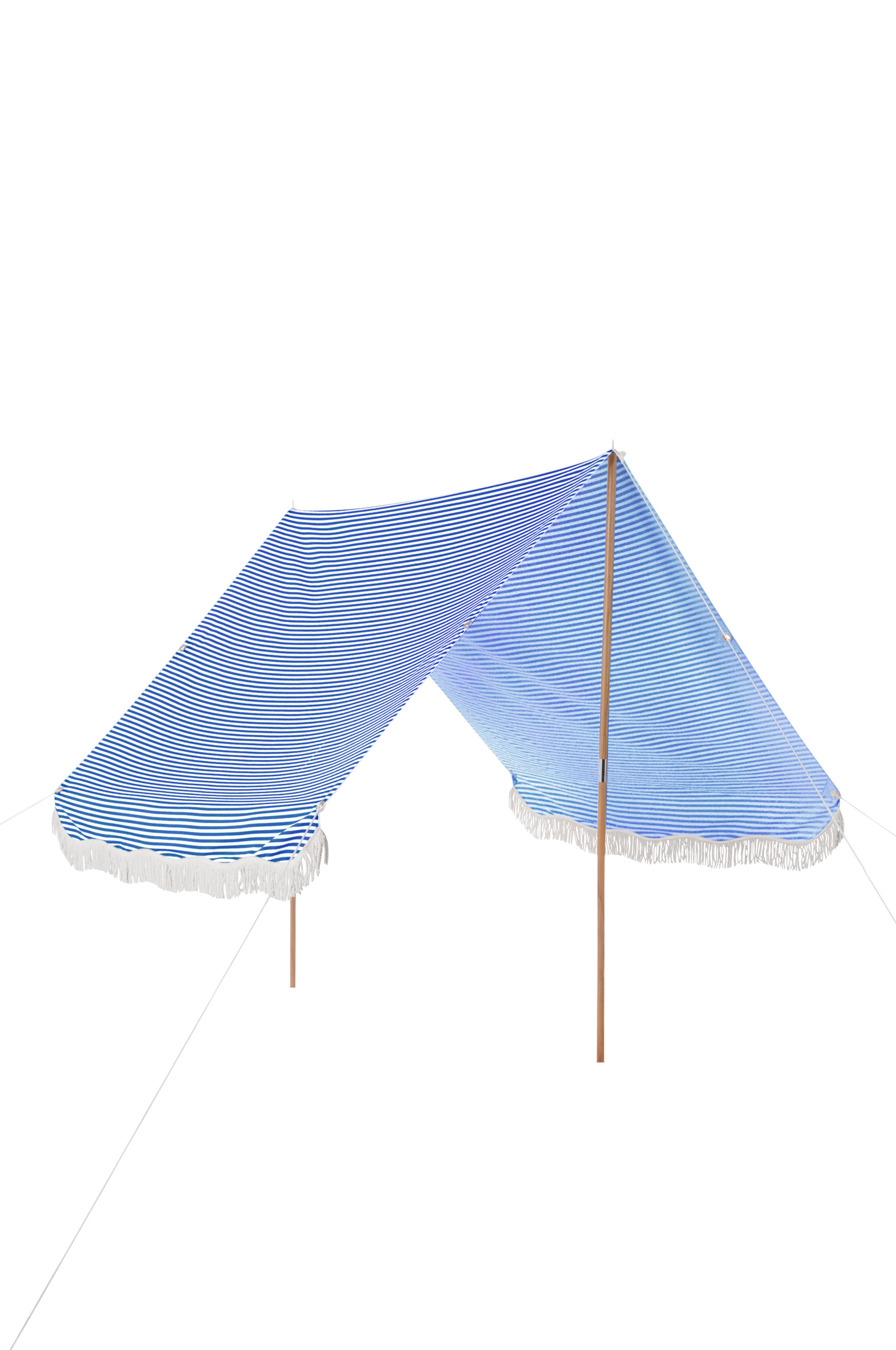 SOMORA er et stripete strandtelt med to stenger av bjørk, vannavvisende stoff av polyester og frynser av polyester. Teltet gir behagelig skygge på stranden eller i hagen. Strandteltets to stenger har spisst bakkefeste som du stikker ned i bakken. Parasollskrue til å forankre produktet i bakken/sanden følger med.