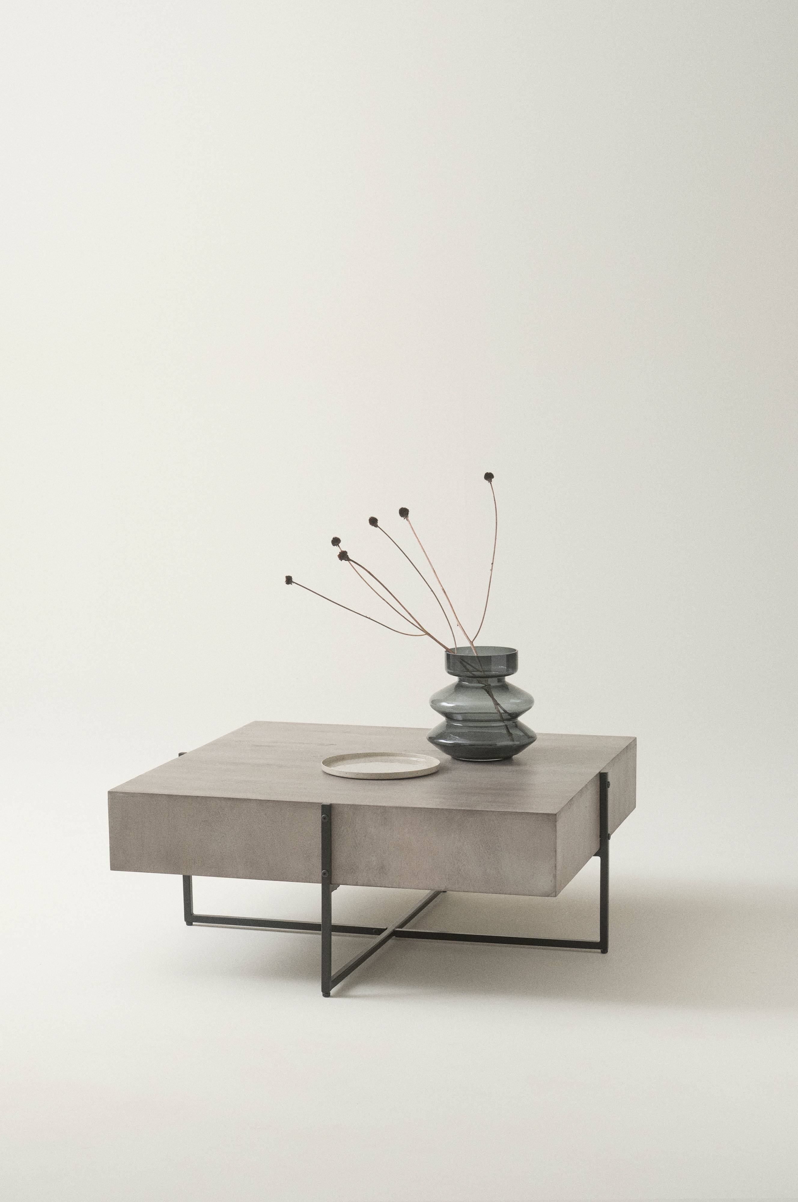 Sofabord med kraftig bordplate av mangotre og understell av jern med pulverlakkert, matt overflate. Bordplaten er hul, og den brede kanten gir et massivt inntrykk. Understellet er montert utenpå bordplaten. Noe montering kreves. Monteringsanvisning medfølger.