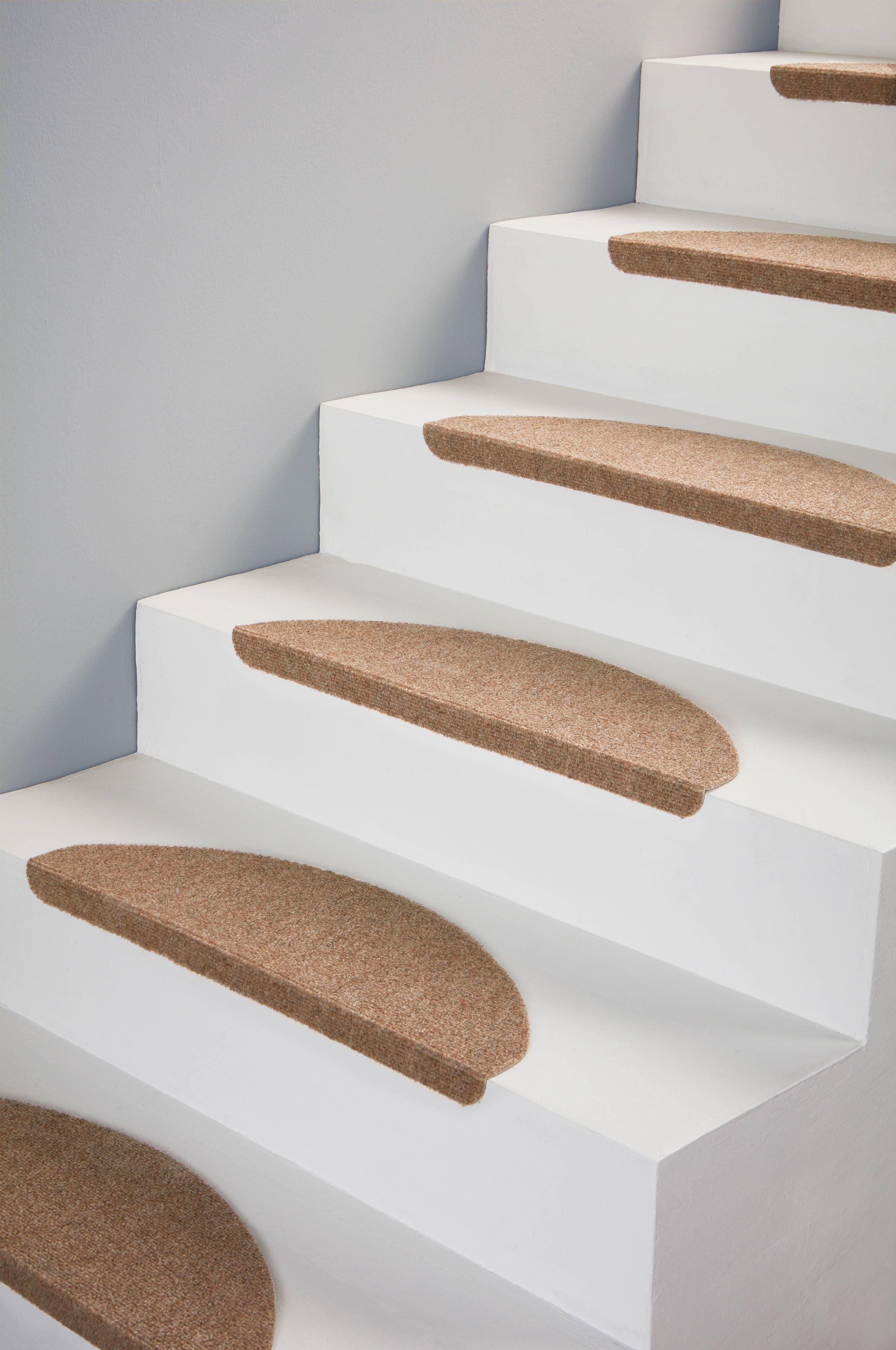 15-pk trappetrinnstepper i tuftet polypropylen med selvklebende bakside. Teppene er ensfargede, og har en halvmåneform som passer de fleste trapper. Teppene har lim på den brettede kanten som holder dem på plass.