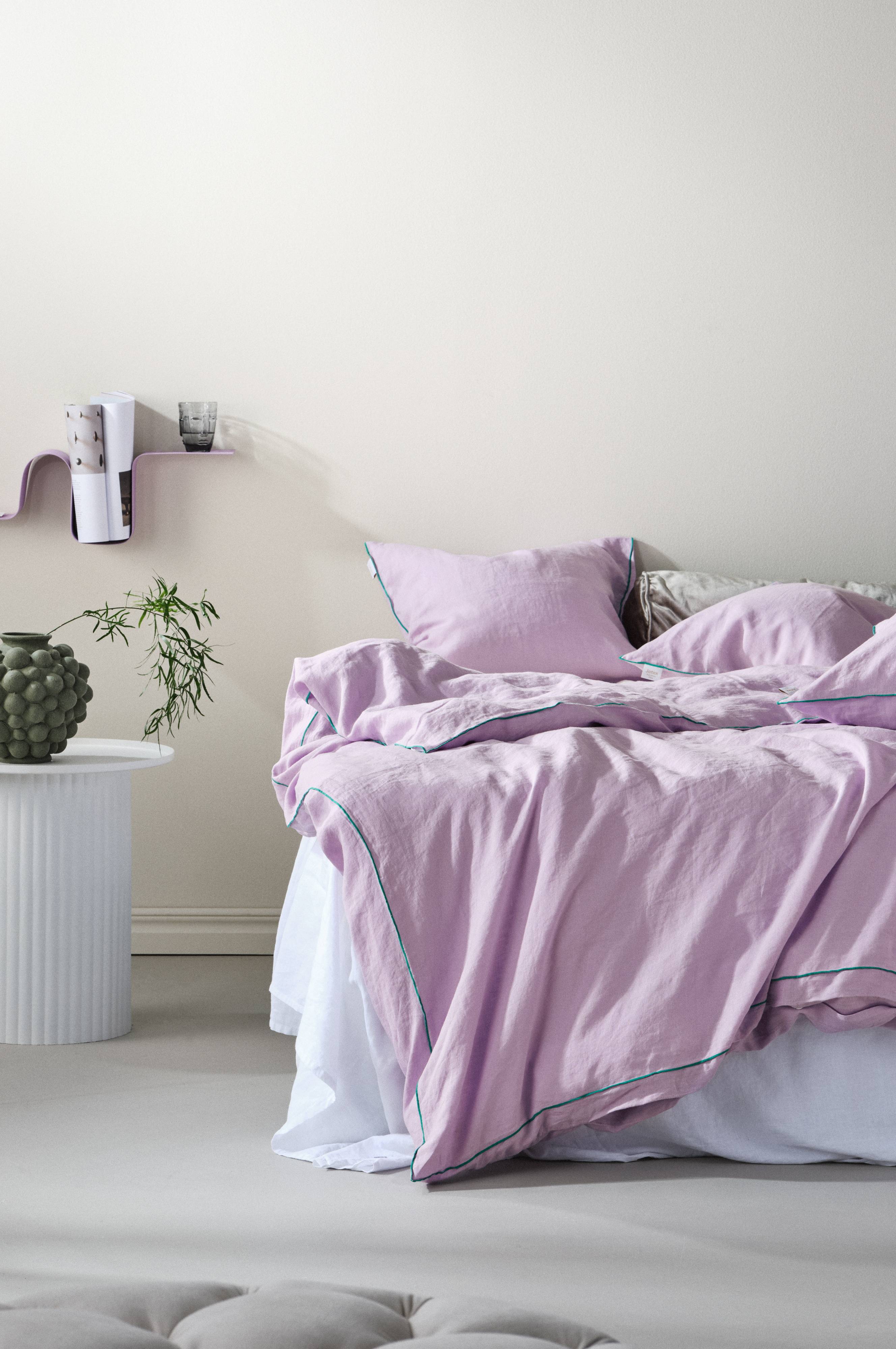 ElpySengesett i tre deler med ekstra bredt dynetrekk og to putevar av lin som er vasket for en ekstra myk følelse. STICH står for deilig sengetøy i et tidløst materiale. Linstoffet er ensfarget, og den pene overlocksømmen rundt er kontrastfarget i en kvikk farge. Lin er et fint naturmateriale med spesielle egenskaper og herlig følelse. Lin varmer når det er kaldt, og er svalt å sove i når det er varmt. Når linet er vasket får det en enda mykere tekstur som er komfortabel mot huden. Åpning øverst i hjørnene på dynetrekket. Det gjør det lettere å tre dynetrekket over dynen. Knapper for lukking av dynetrekket. Trådtetthet på 104 tc. (Trådtettheten forteller om antallet tråder, thread counts, pr. kvadrattomme i et stoff. Jo høyere trådtetthet, desto høyere kvalitet. Unntaket er lin som ofte veves løsere for å få den riktige følelsen.)