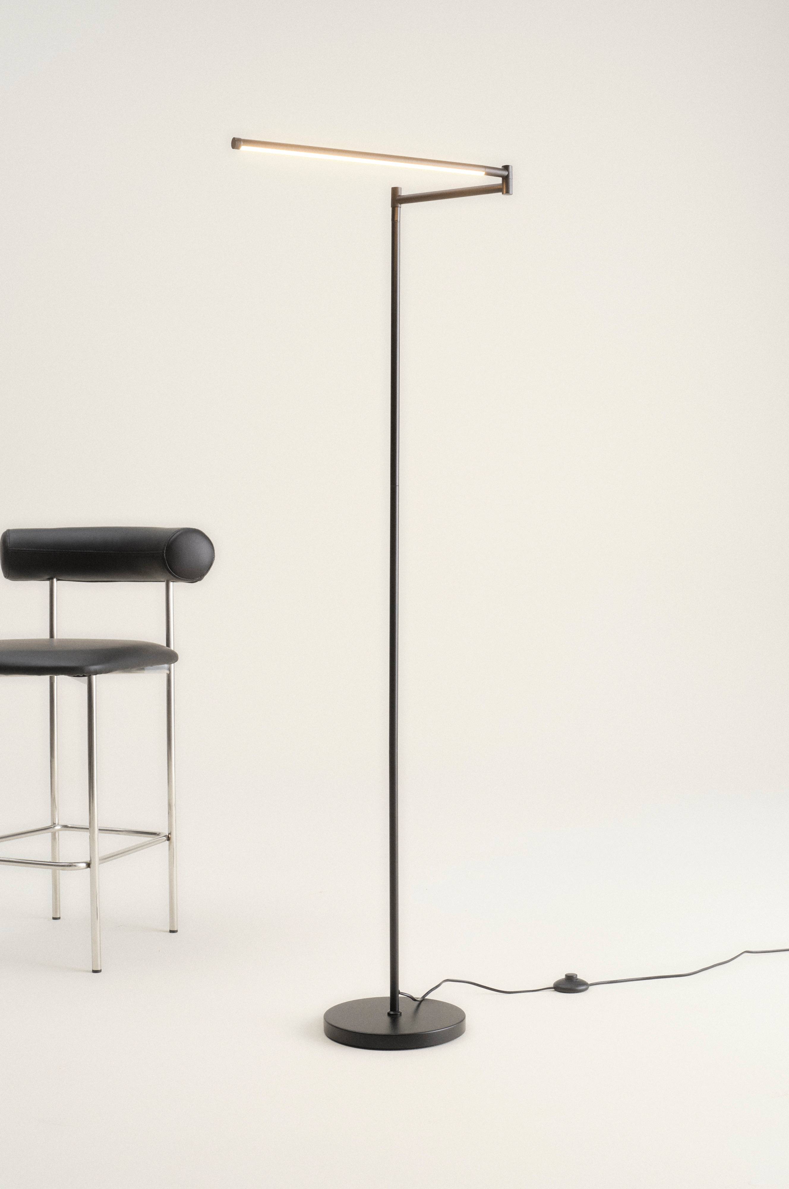 Gulvlampe av jern med leddet arm. Delen som belysningen sitter i er av aluminium. TEIDE er i elegant, minimalistisk stil. Hele lampen er homogent mattsvart. LED-belysningen er integrert, så du trenger ikke tenke på lyspære i tillegg. Dessuten har gulvlampen integrert fotdimmer som sitter på ledningen. TEIDE gir et behagelig lys, og med trinnløs dimmer styrer du styrken akkurat som du vil ha den. Lampen er ujordet, klasse 2.