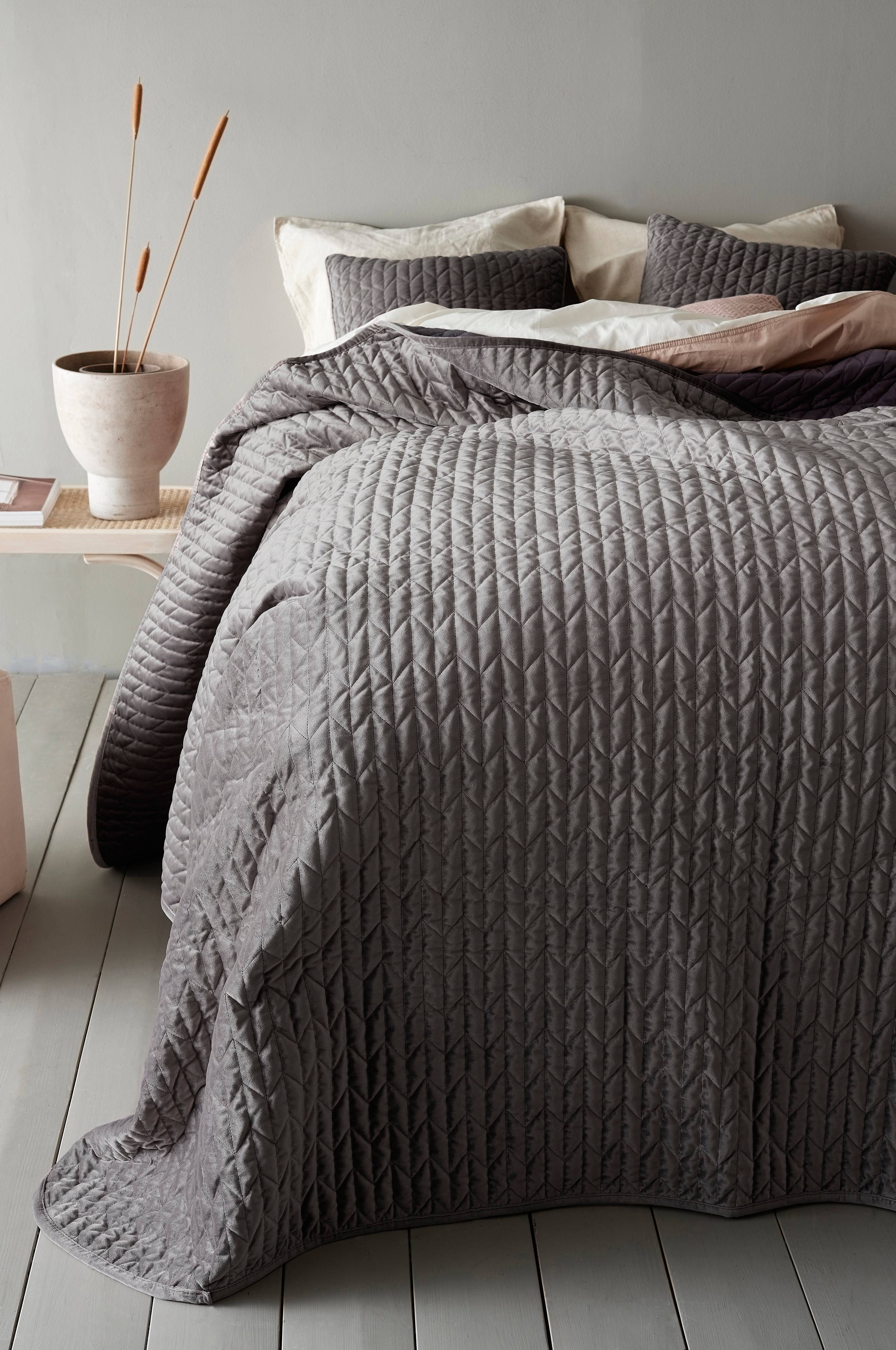 Sengeteppe i quiltet fløyel med dekorative sømmer og piping rundt.